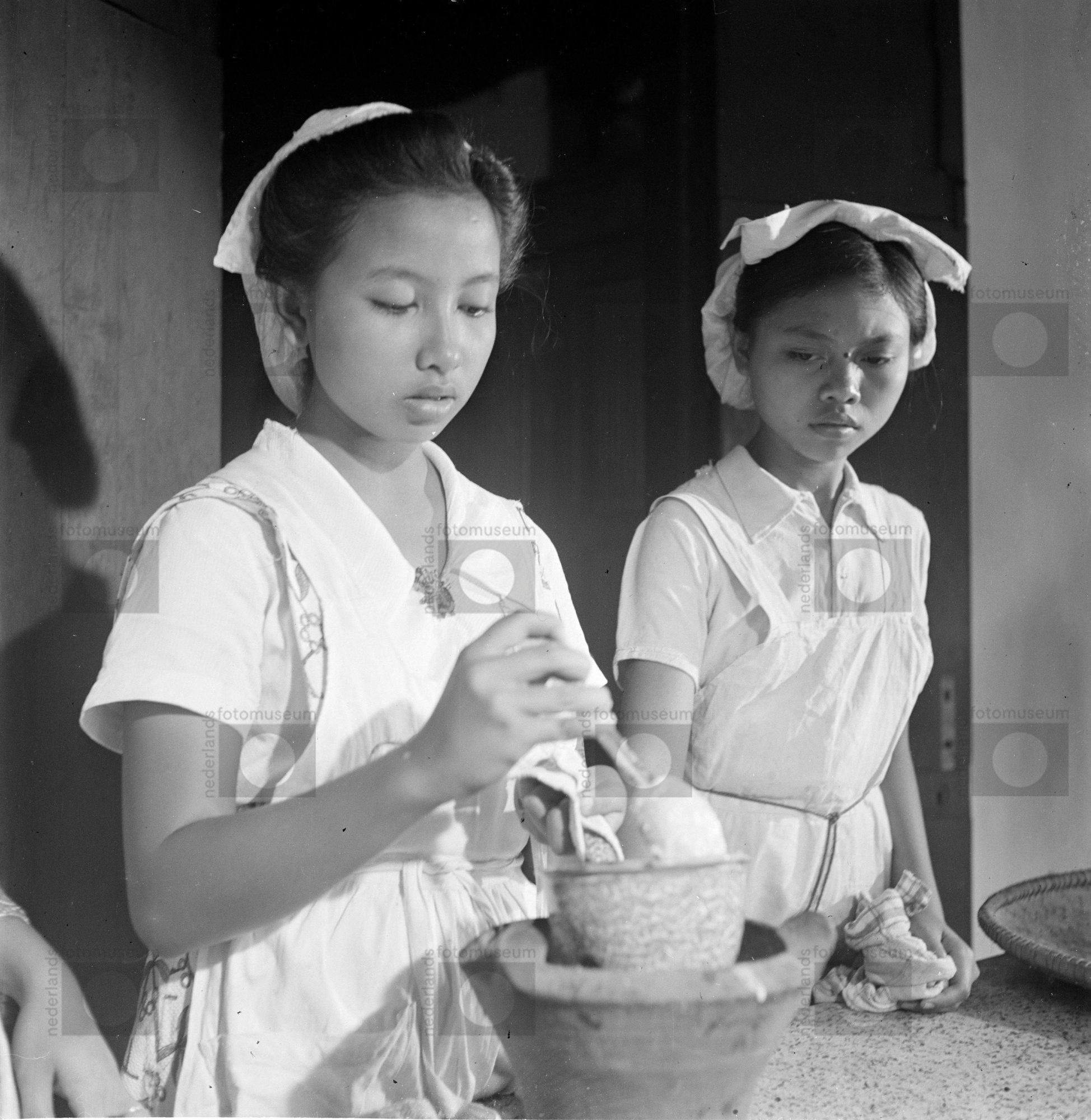 Meisjes krijgen kookles in een huishoudschool te Jak...