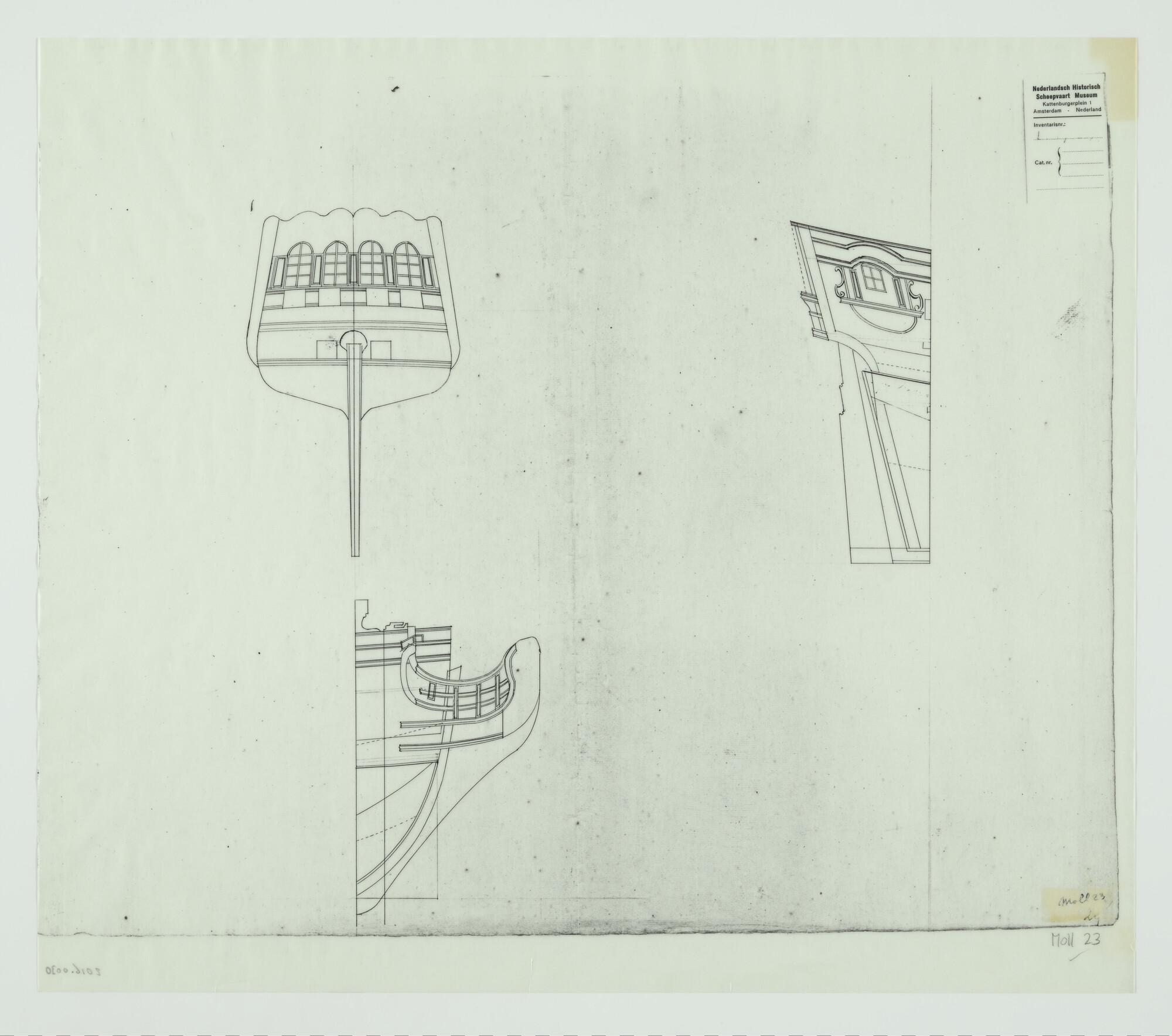 Spiegel en galjoen van een oorlogsschip uit de achtt...