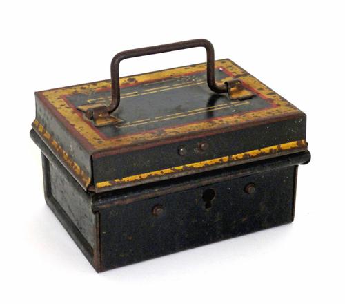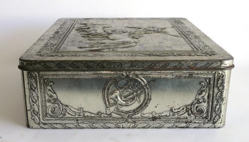 Pijptabak trommel. Metalen rechthoekig blik met iet...