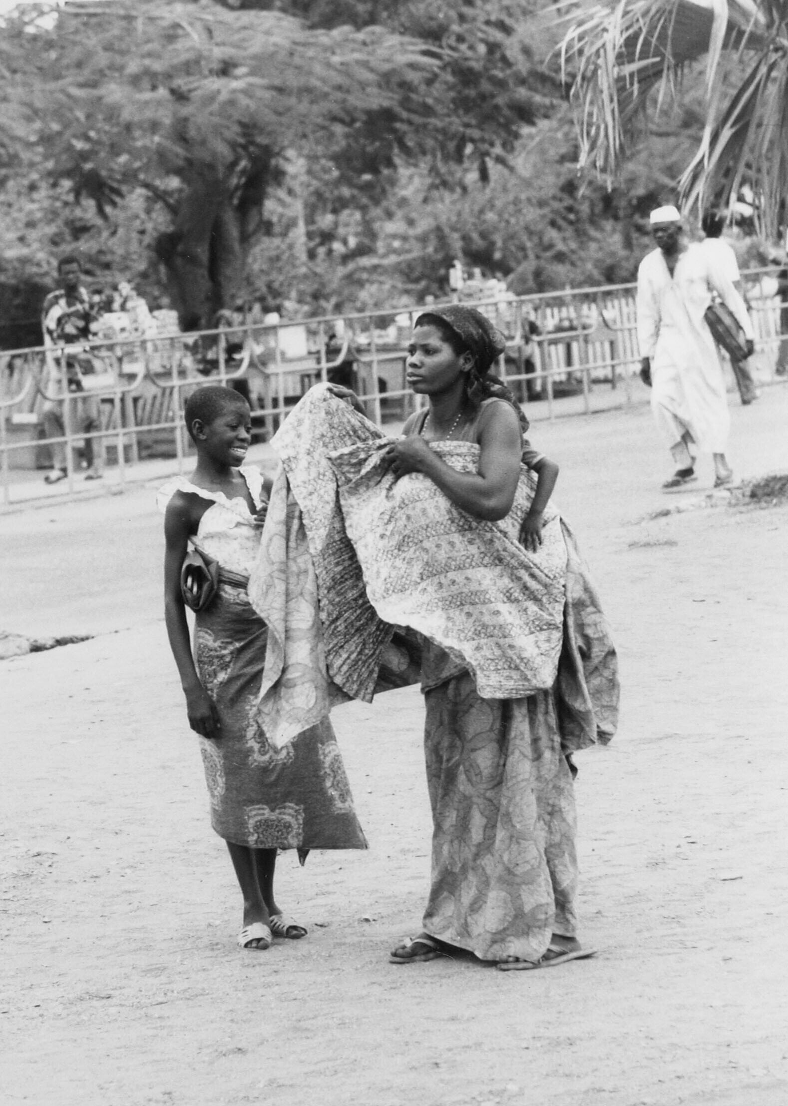 Straatbeeld: vrouw bezig een draagdoek voor haar kin...