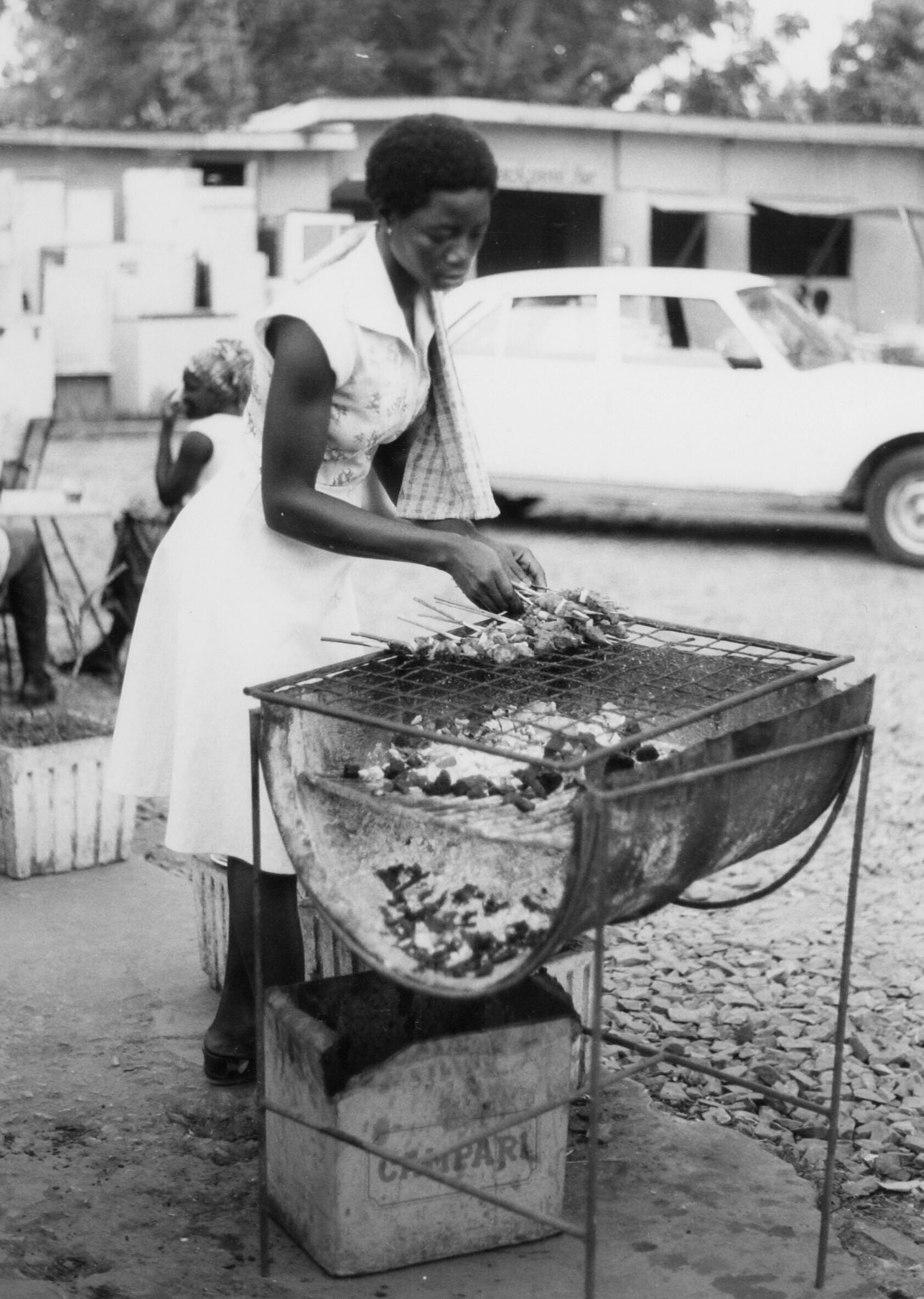 Het grillen van kebabs (vleesspiezen). Een half vat ...