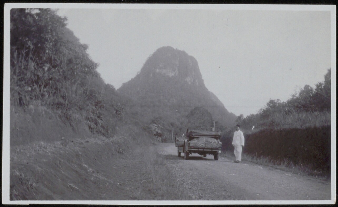 Auto met chauffeur uit Batavia op een weg bij een vu...