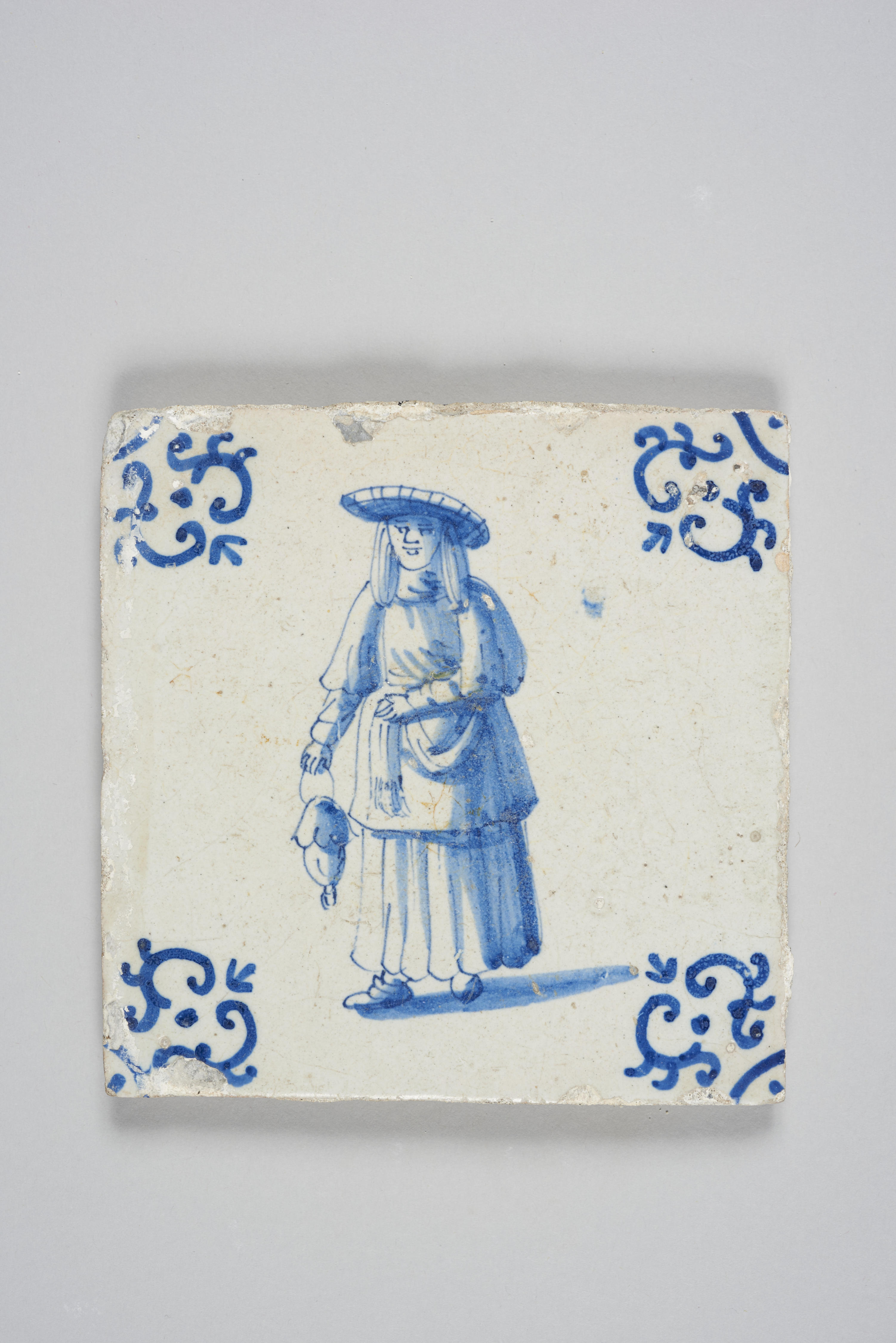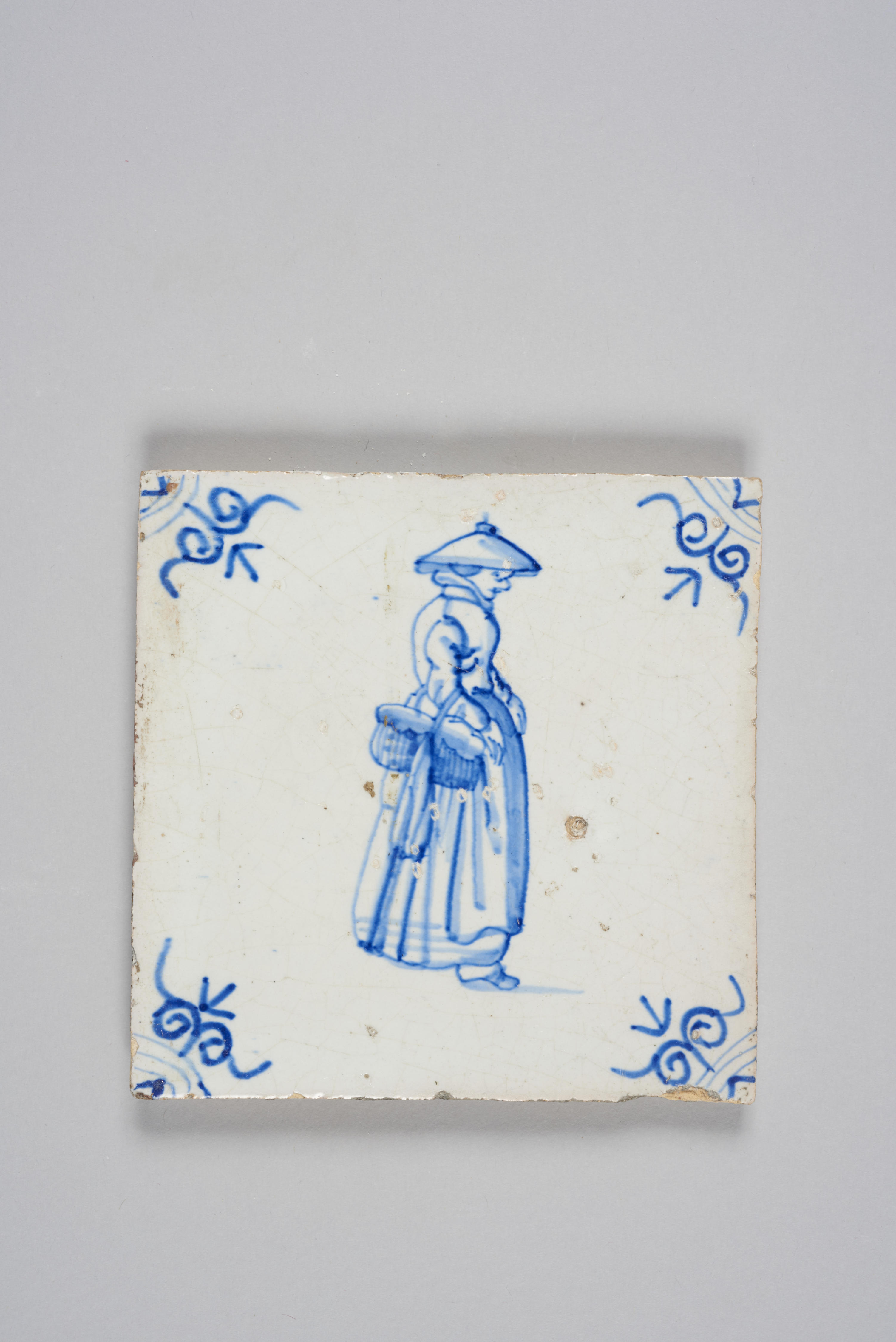 Wandtegel met afbeelding vrouw met mand en buidel, 1...
