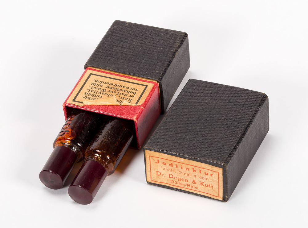 Twee glazen flesjes jodiumtinctuur in kartonnen verp...