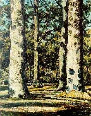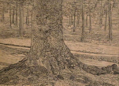 Bos met drie grote boomstammen - waarvan de voorste ...