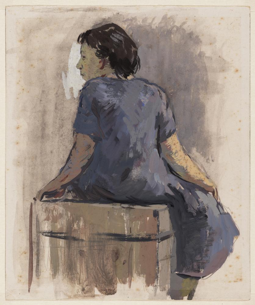 Vrouw zittend op kist