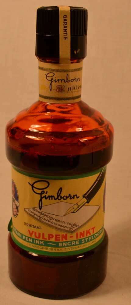 Inktfles van glas gevuld met rode normaal vulpeninkt...