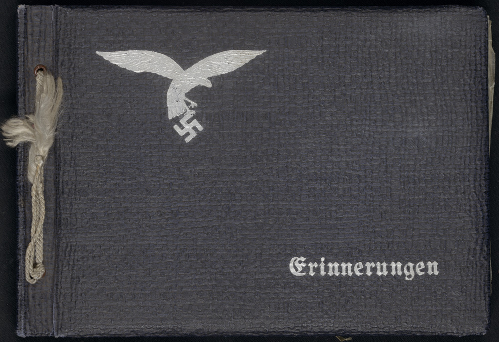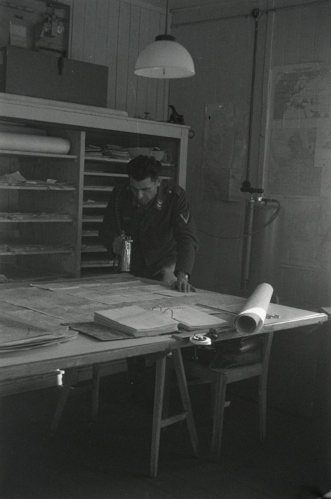 Een Luftwaffe Gefreiter staat gebogen over een teken...