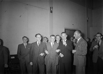 Personeel op afscheid gedeputeerden in Den Haag, 1954