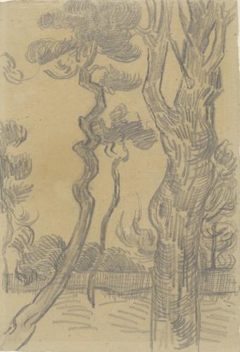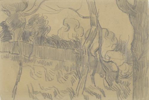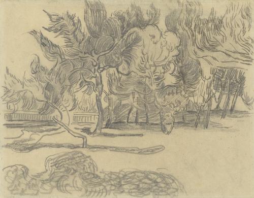 Bomen, stenen bank en fontein in de tuin van de inri...