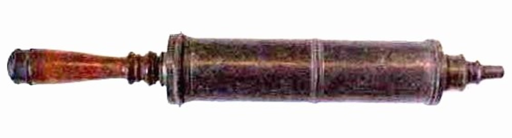 klisteerspuit van tin, houten steel , afschroefbare ...