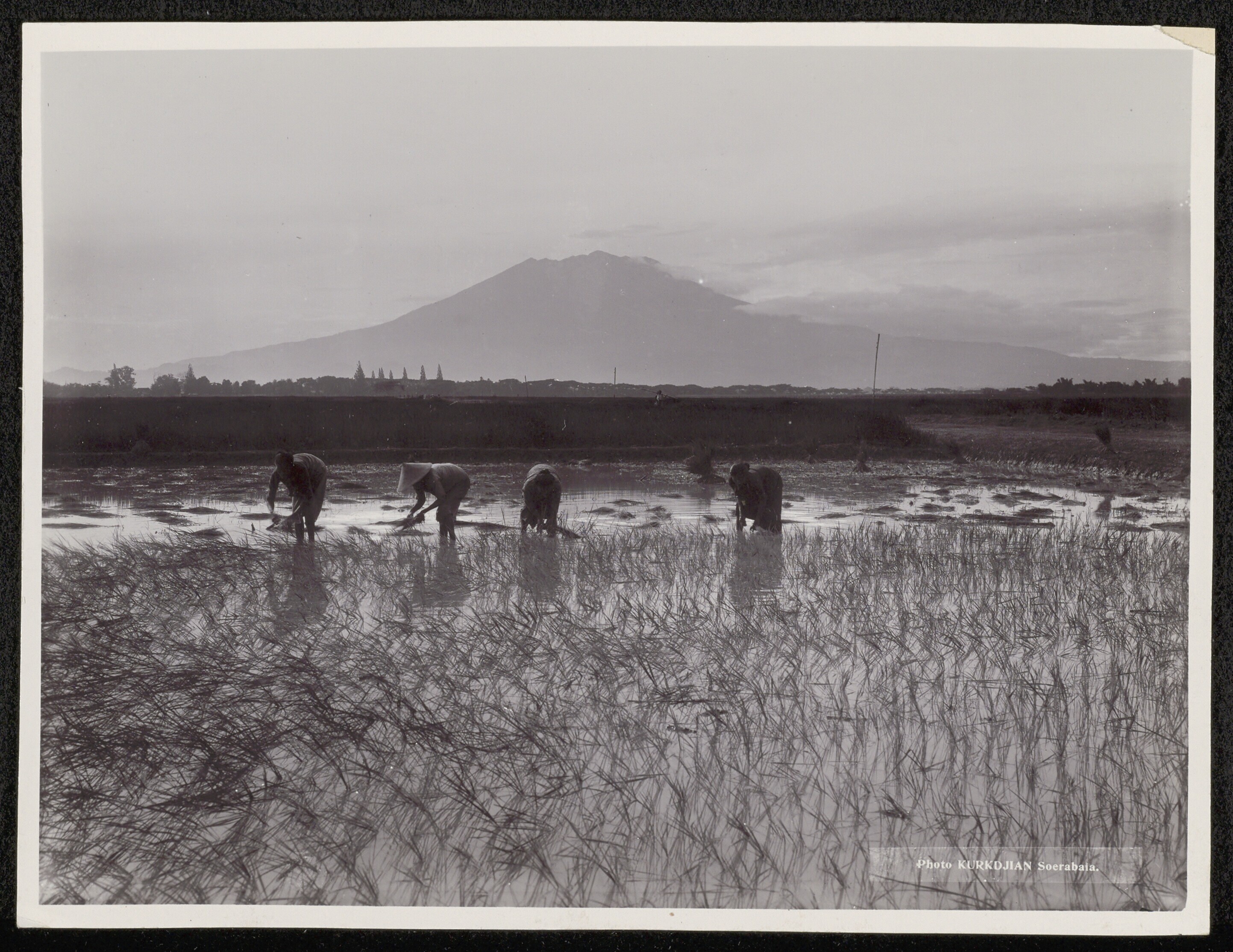 Vrouwen planten rijst in een sawa bij Madioen, met d...