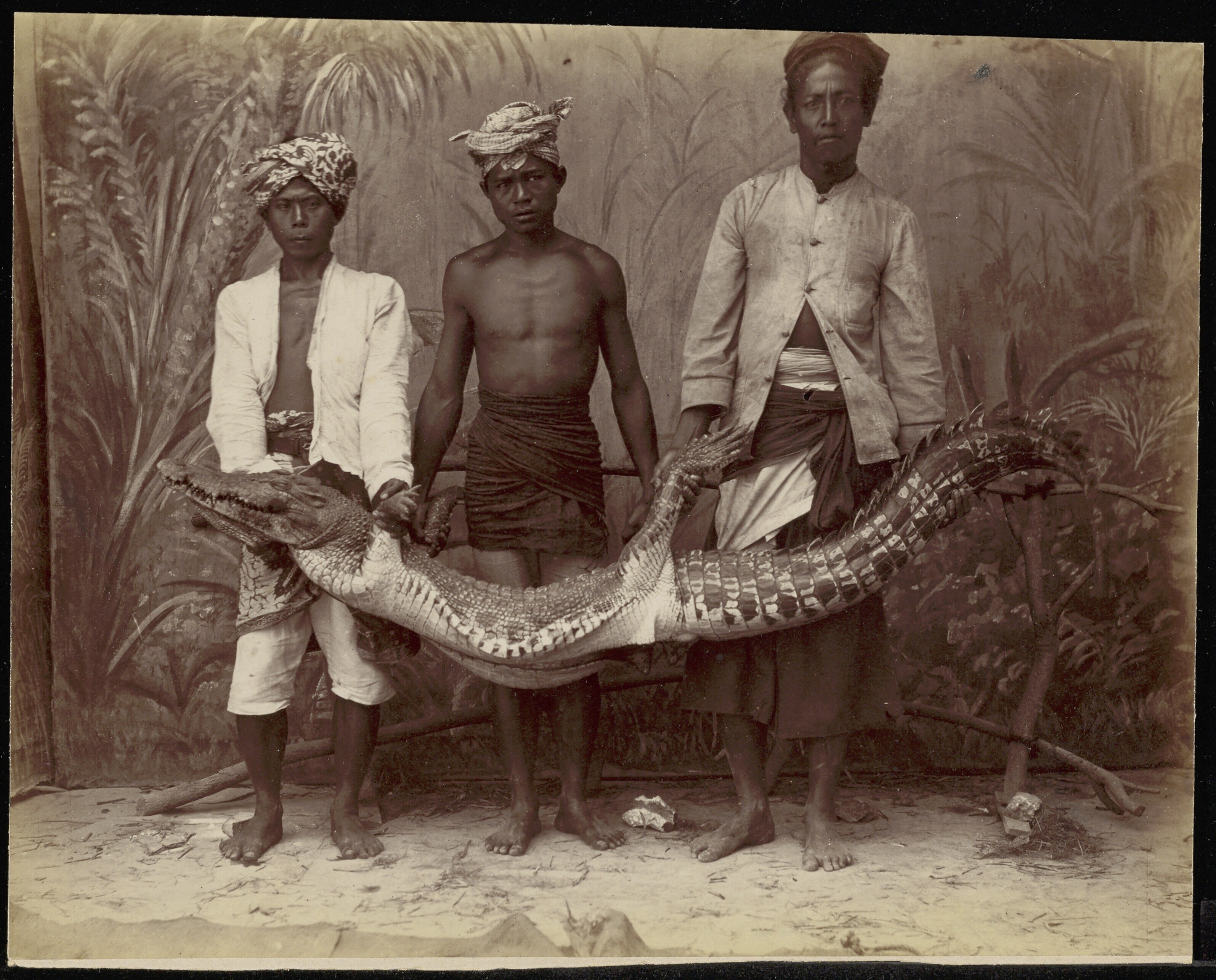 Studioportret met een gevangen kaaiman of krokodil
