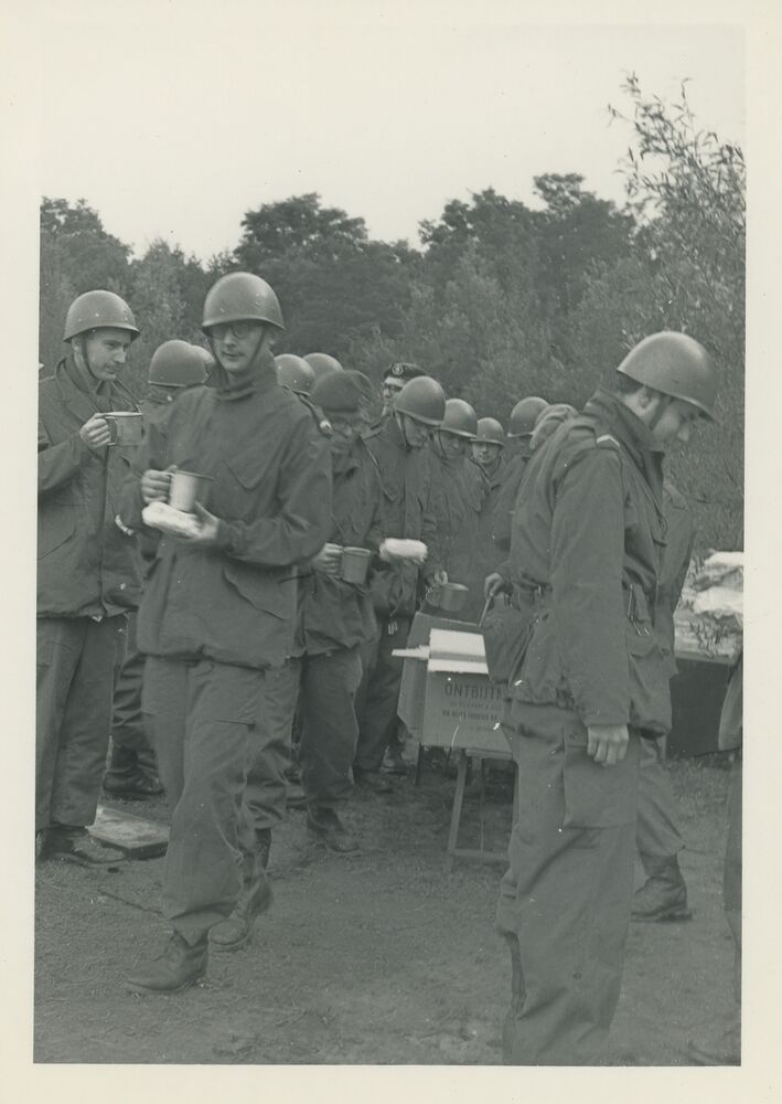 Soldaten halen de lunch op tijdens een oefening