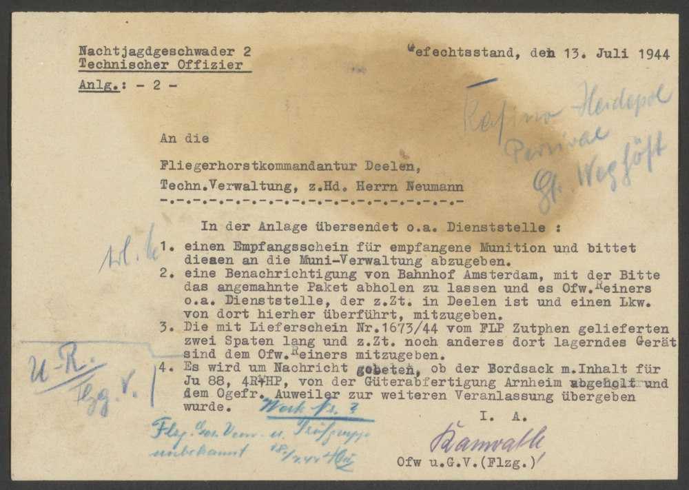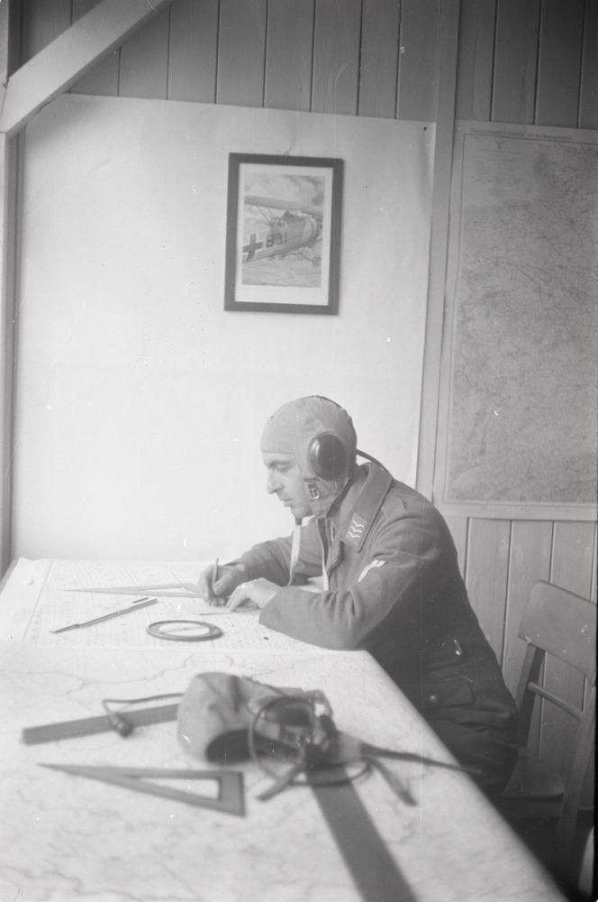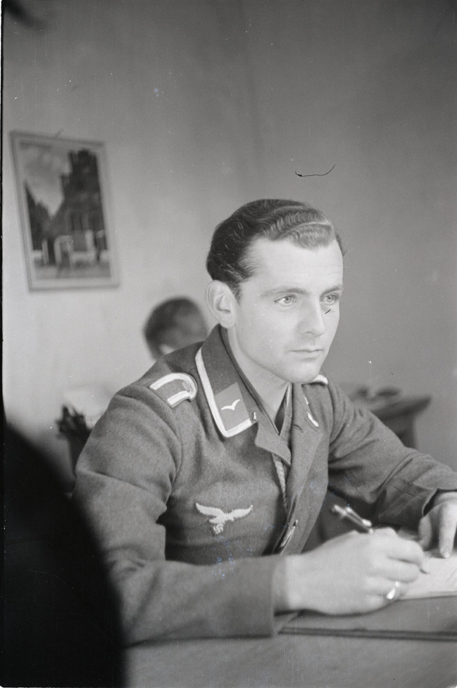Een Luftwaffe Unteroffizier schrijvend achter een bu...