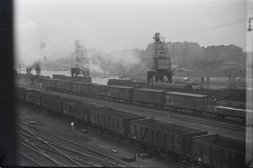 Een spooremplacement met wagons, schepen worden gelo...