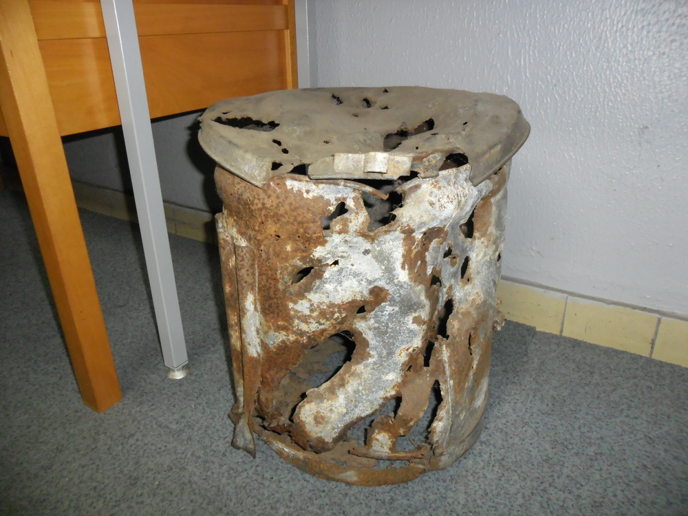 Vuilnisbak met deksel en veel scherfgaten