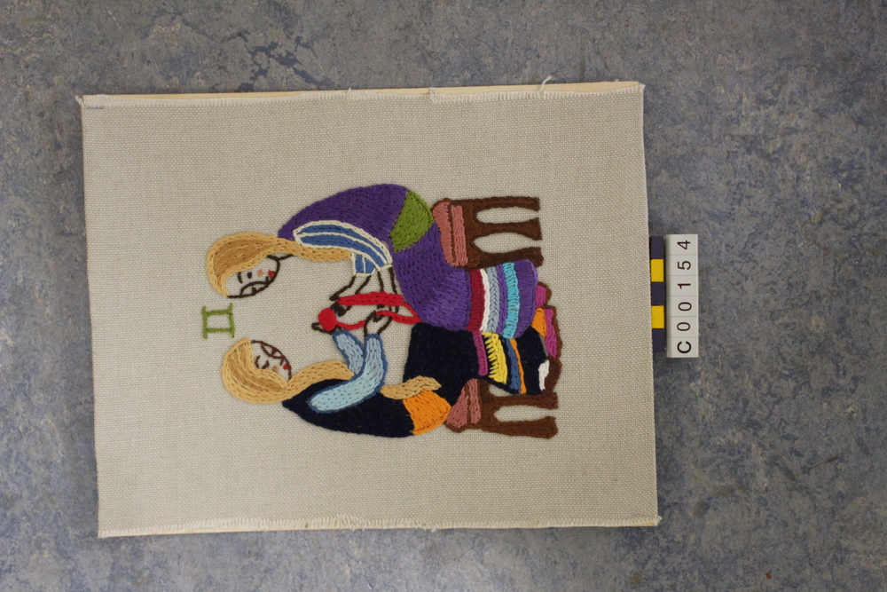 Borduurwerk voorstellende twee vrouwen die een breiw...