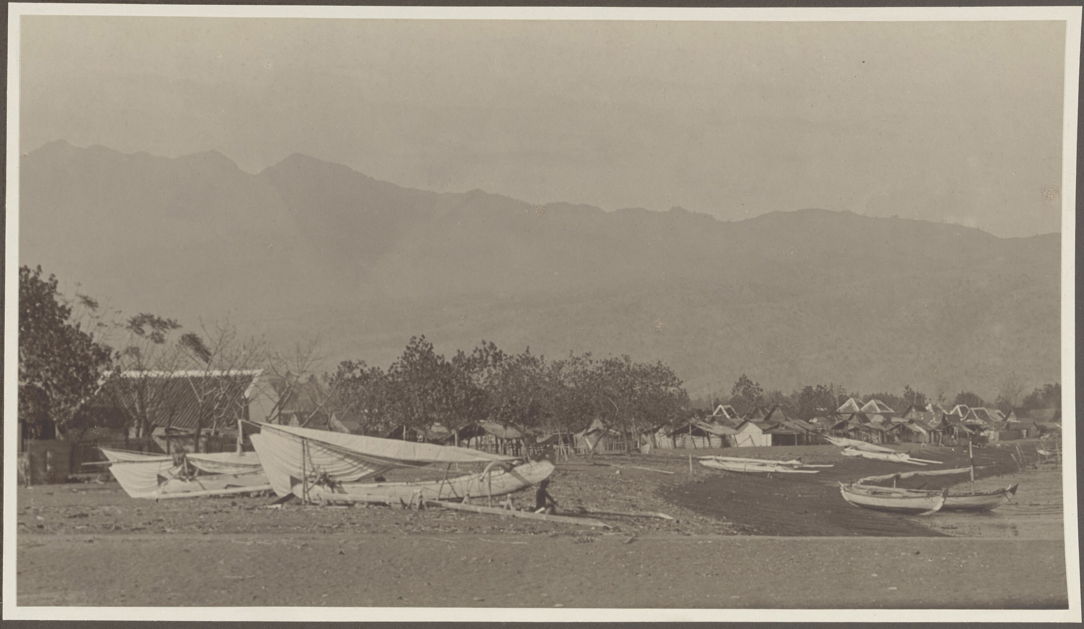 Strandgezicht met prauwen voor anker bij Banjoewangi...