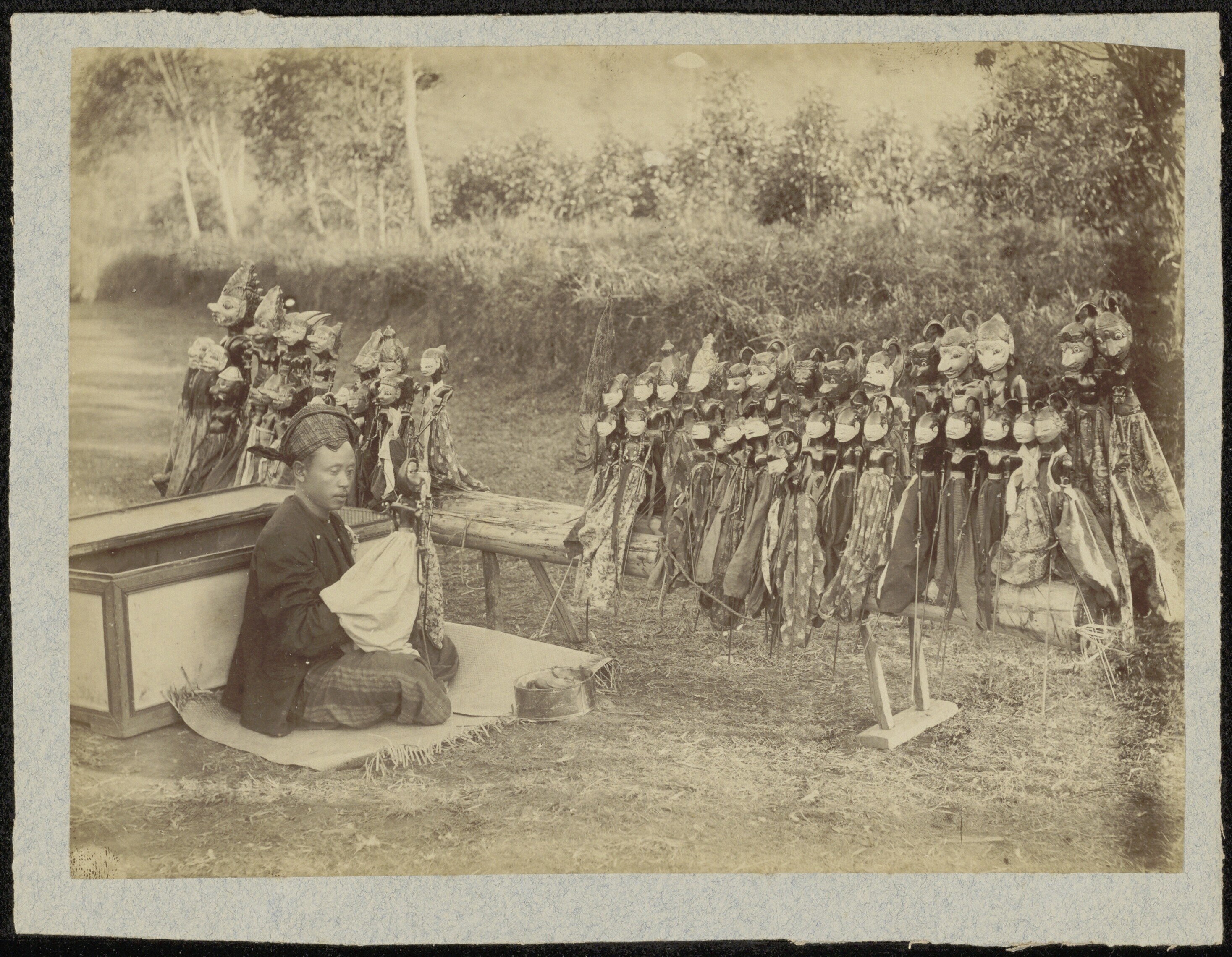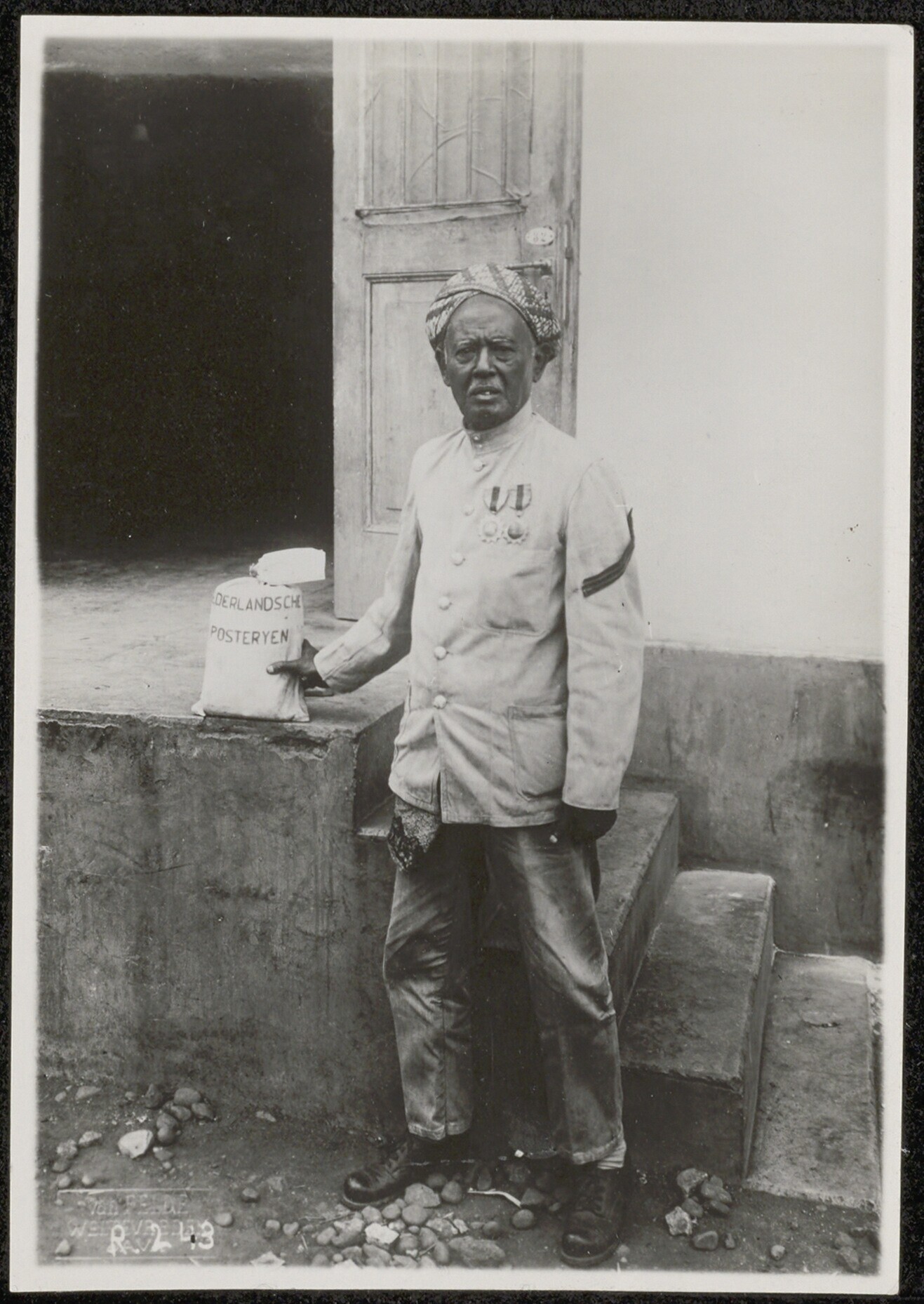 Javaanse postbeambte poseert naast de zak luchtpost ...