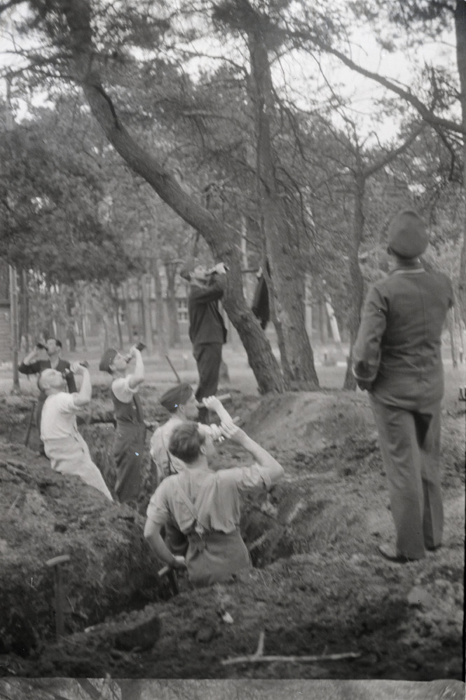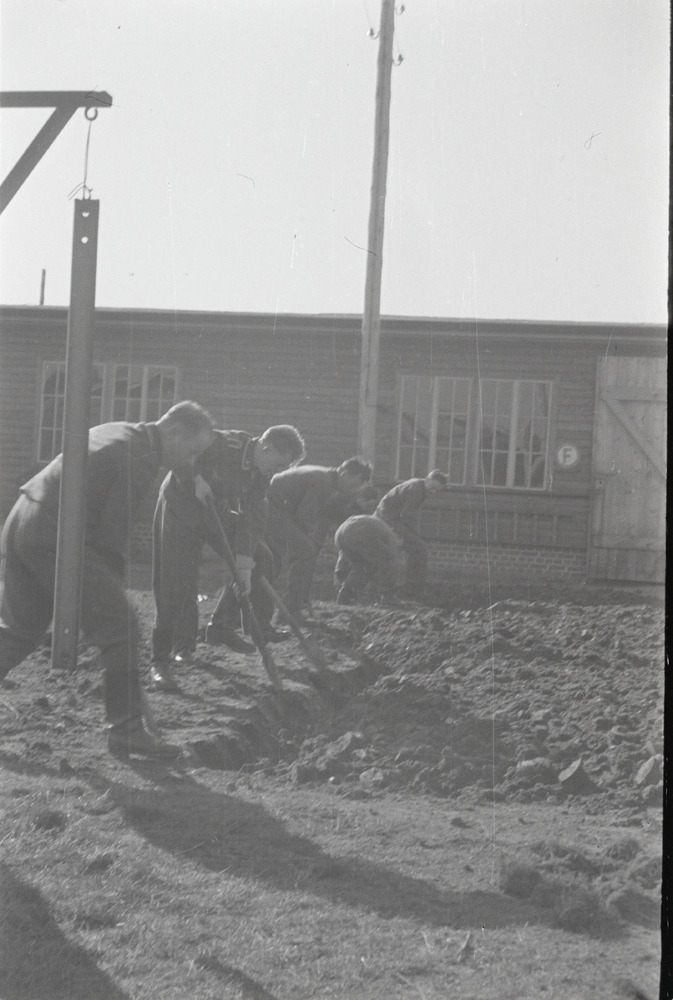 Soldaten spitten een veld om naast een barak.