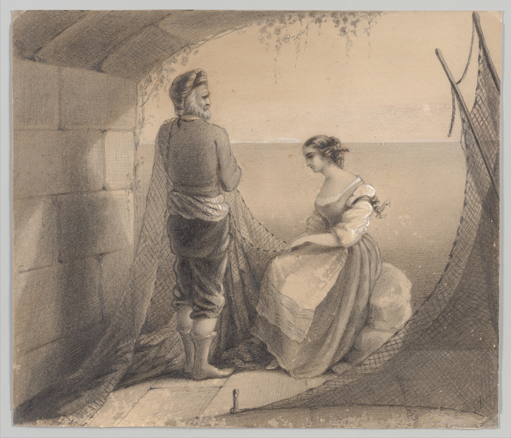 Een visser en een nettenboetende vrouw