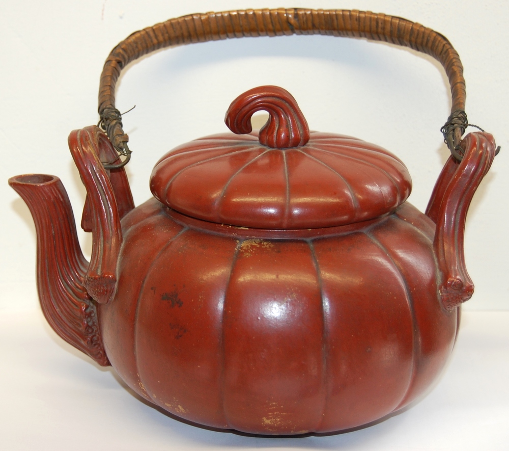 chocoladeketel van geel aardewerk en steenrood gesau...