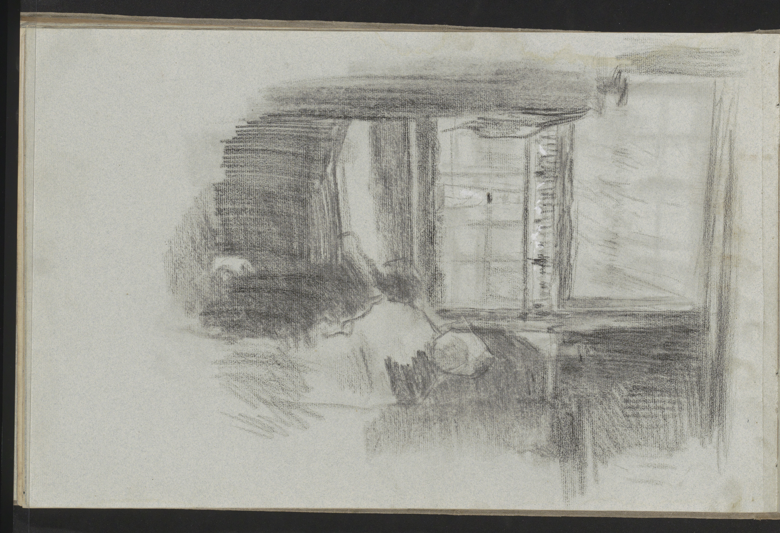 Interieur met een handwerkende vrouw bij een raam