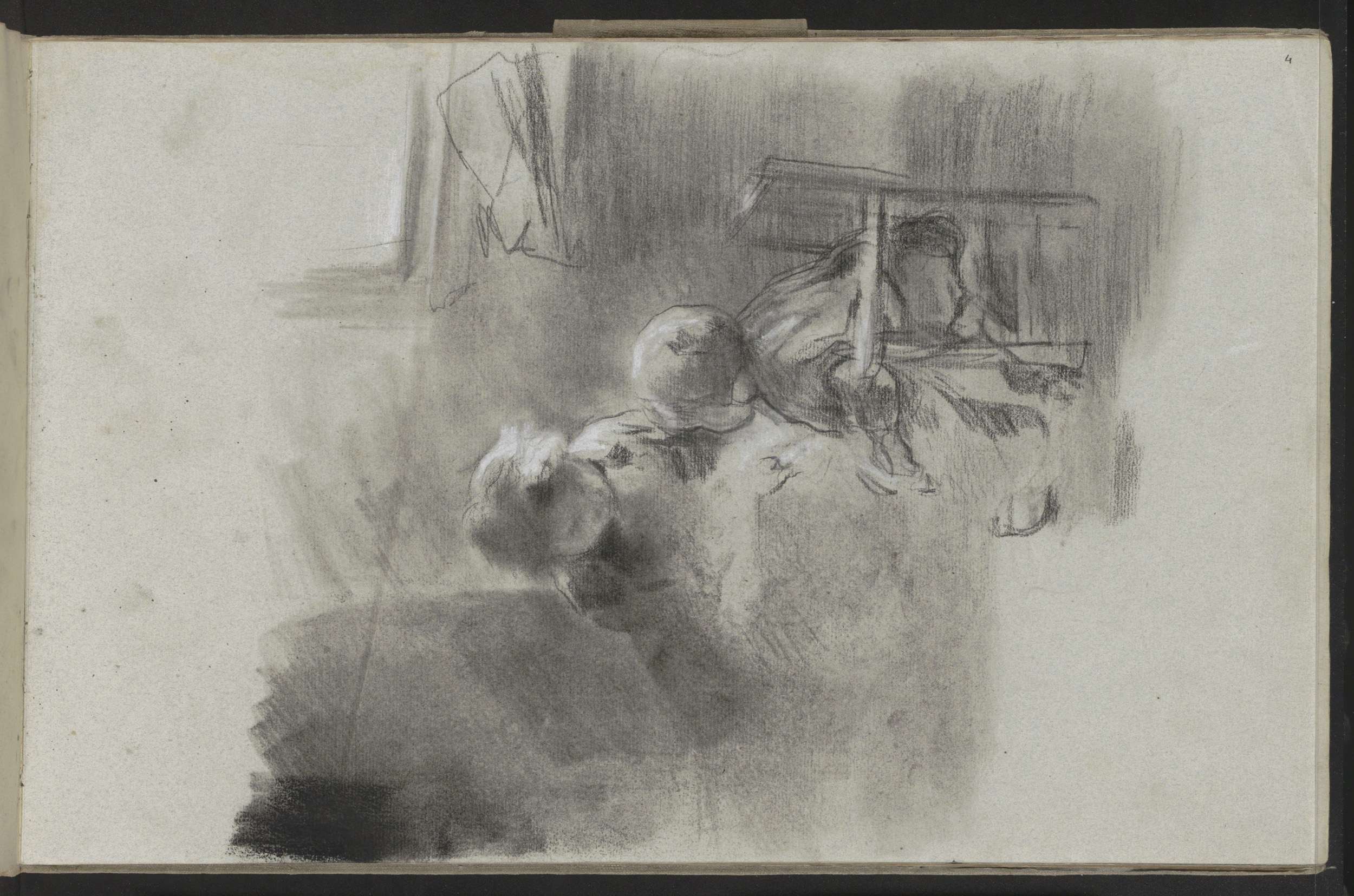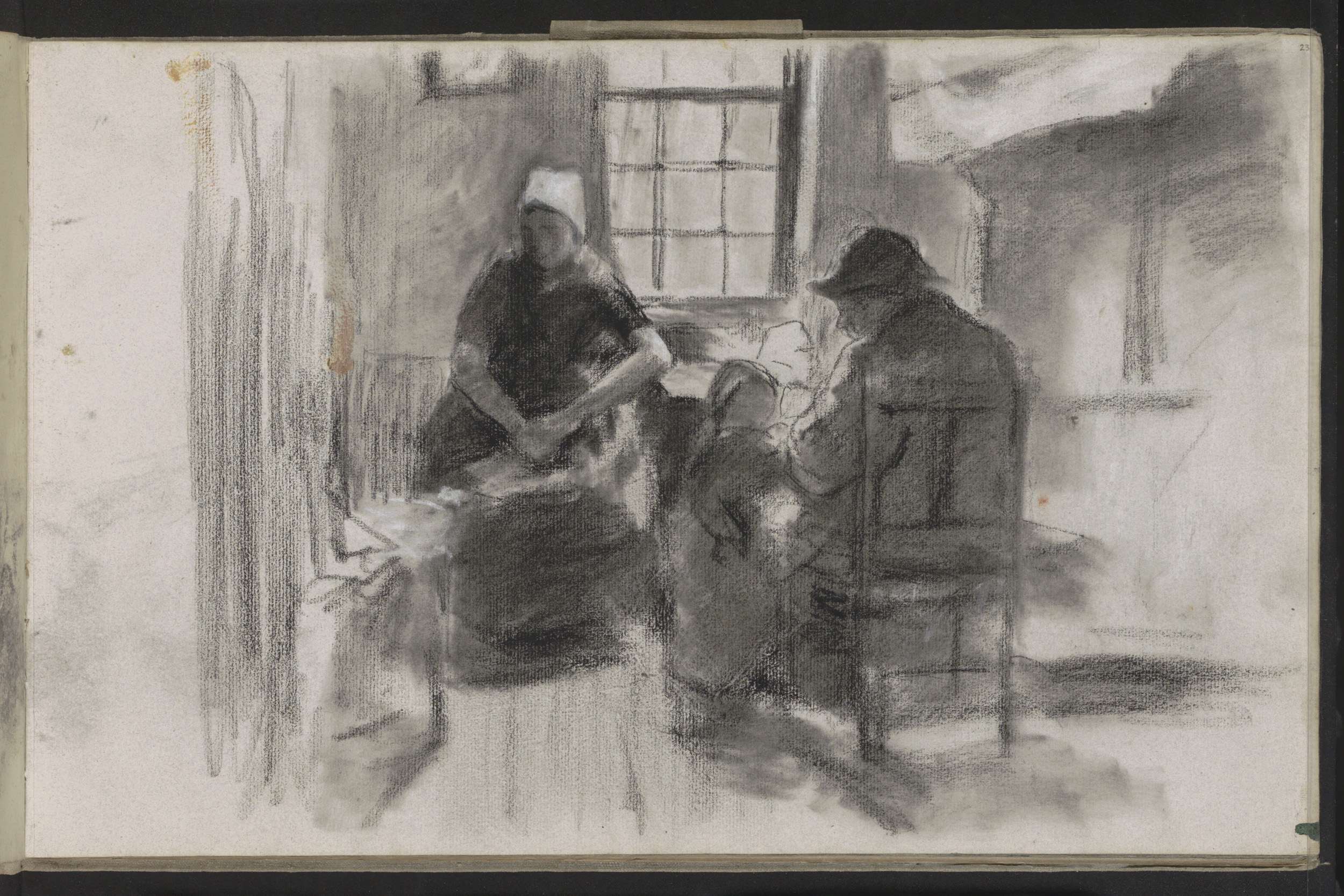 Interieur met een handwerkende vrouw en een kind bij...