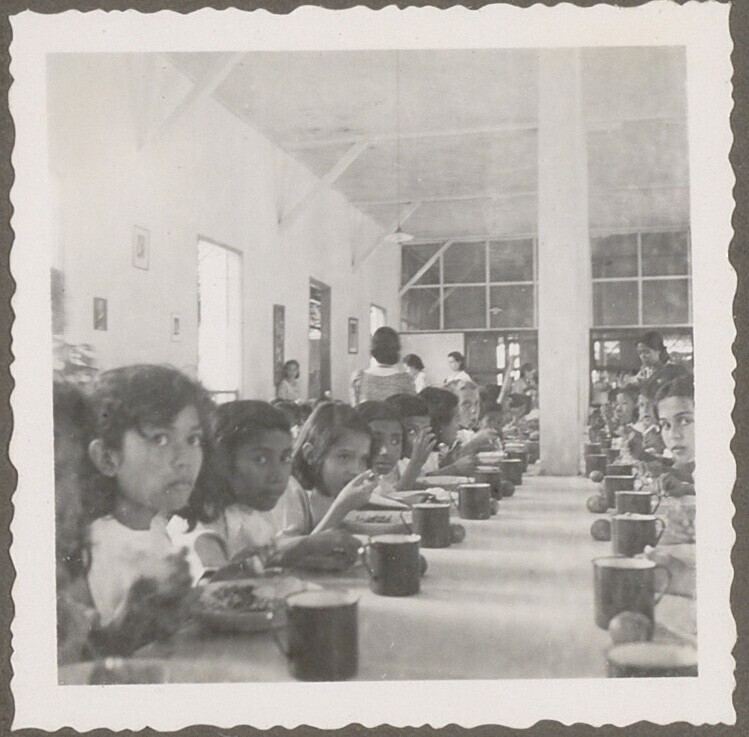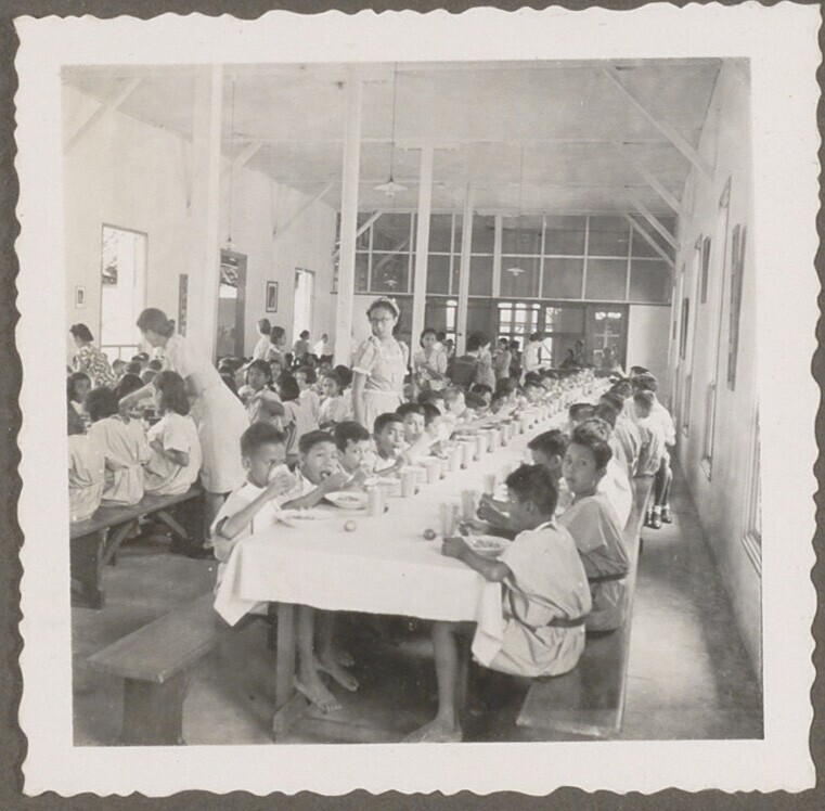 Kinderen in de rij in kindervacantiehuis voor weeski...