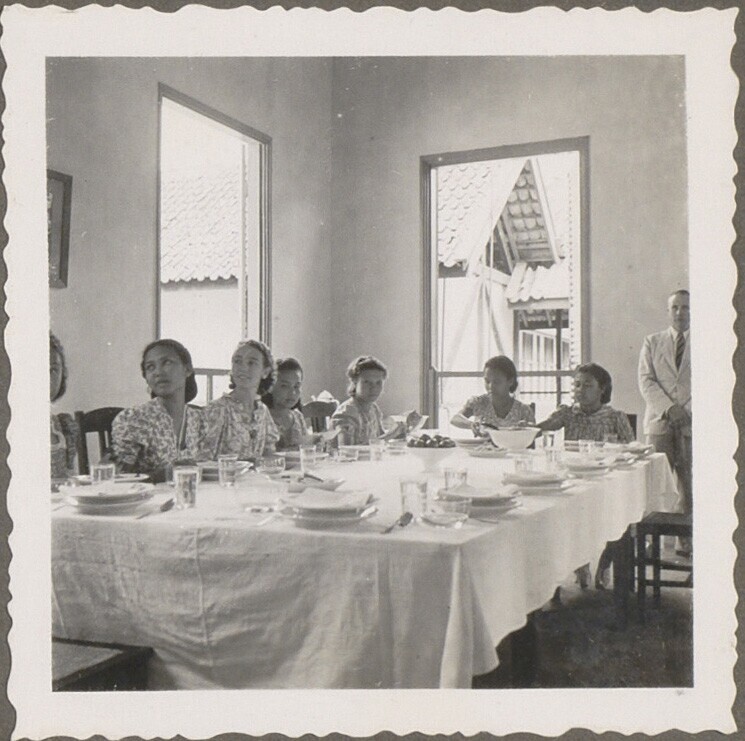 Leraren aan de eettafel in kindervacantiehuis voor w...