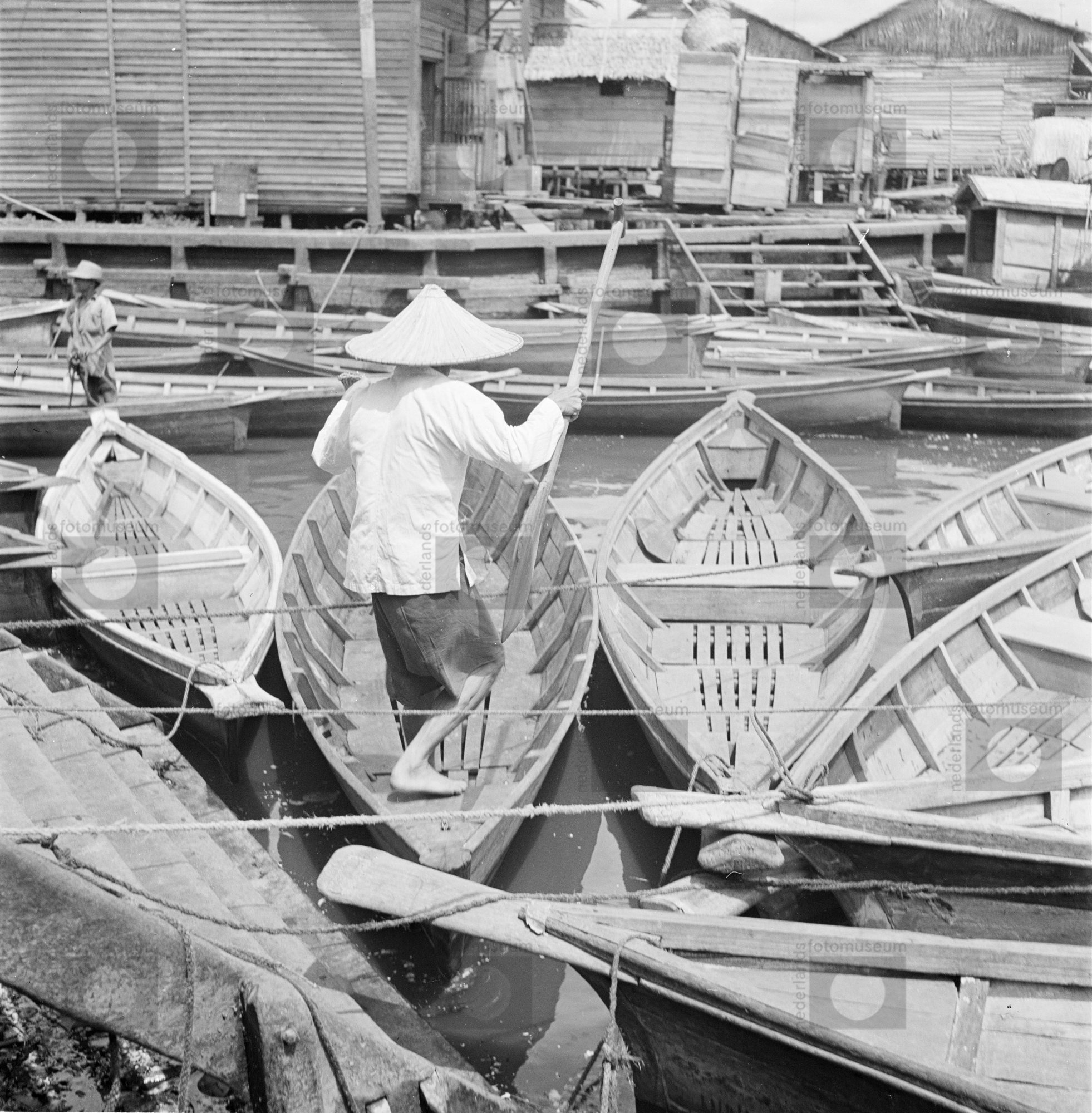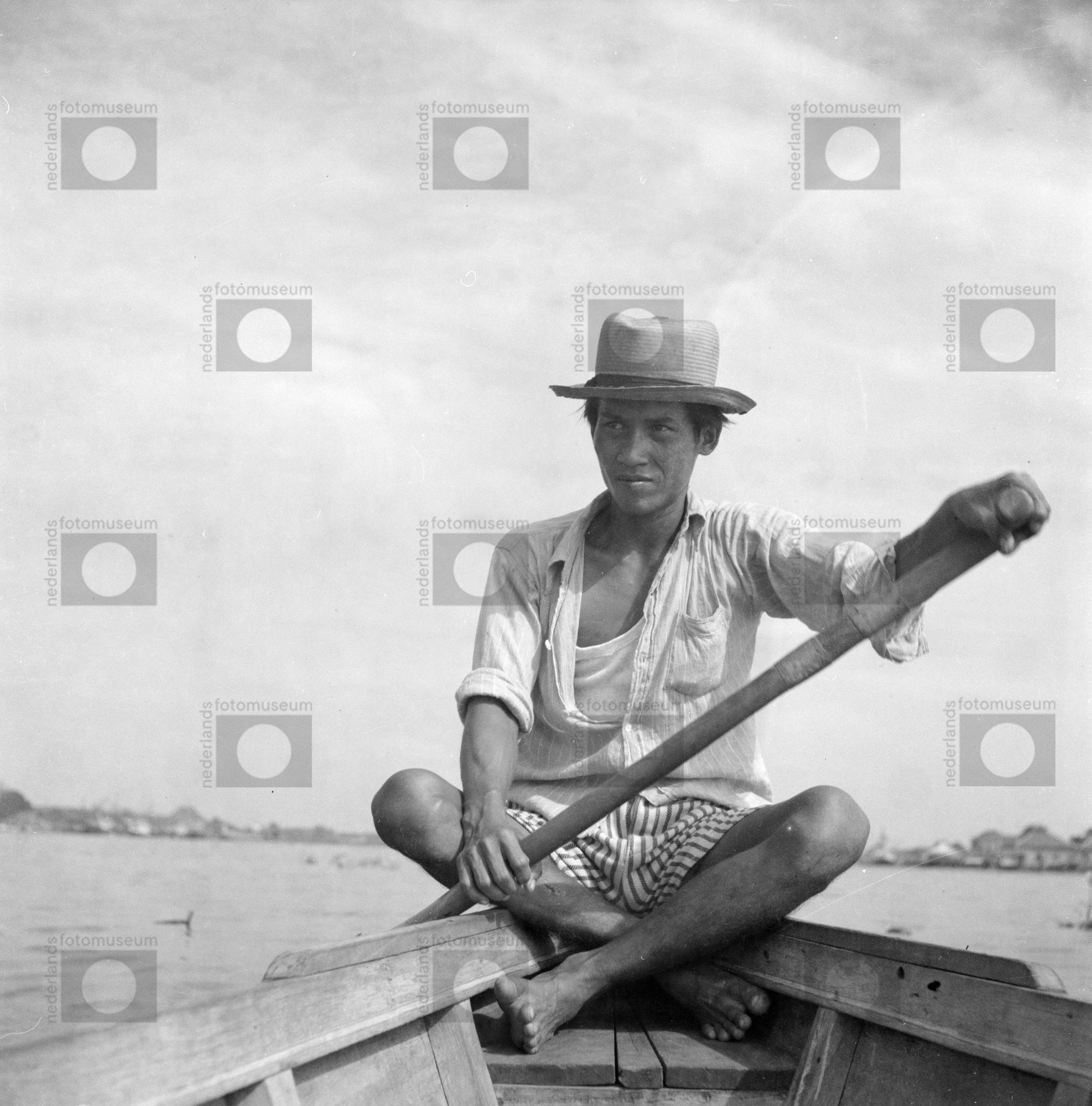 Groepsportret in interieur, Indonesiërs bij boten op...