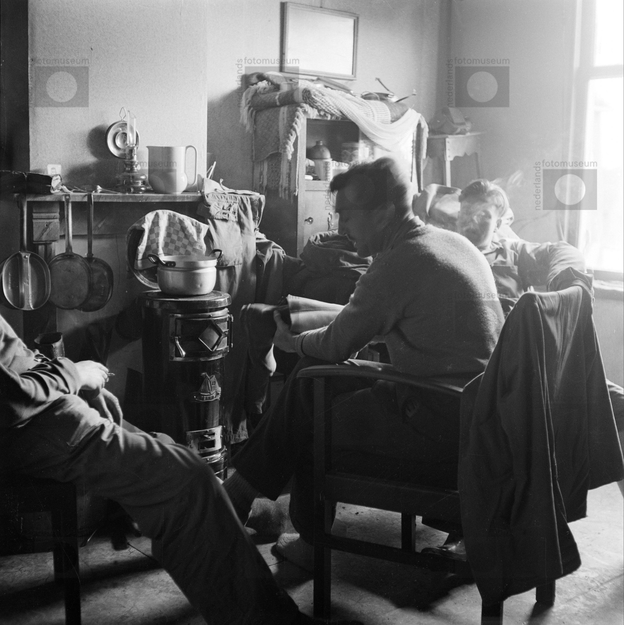 Man poetst schoenen bij potkachel in interieur vlak ...