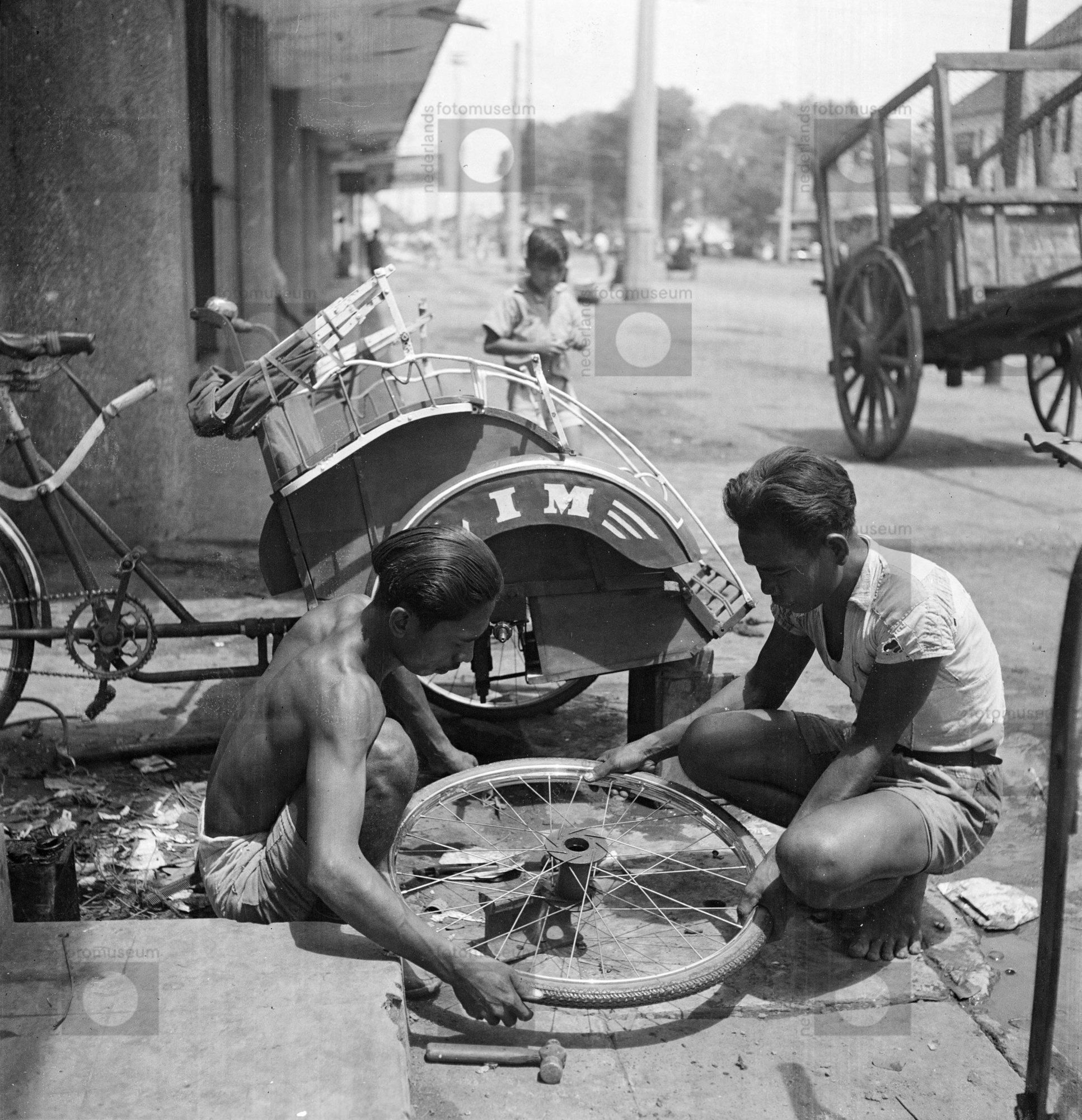 Een betja-bestuurder repareert zijn fietstaxi voor h...