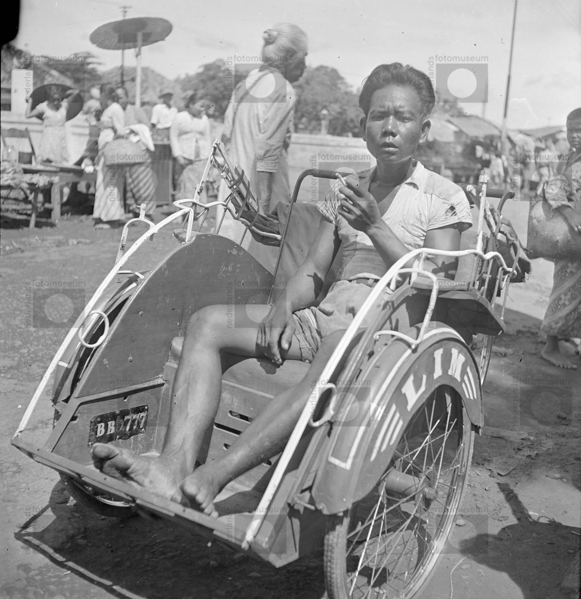 Een betja-bestuurder poseert, gezeten voorin zijn fi...