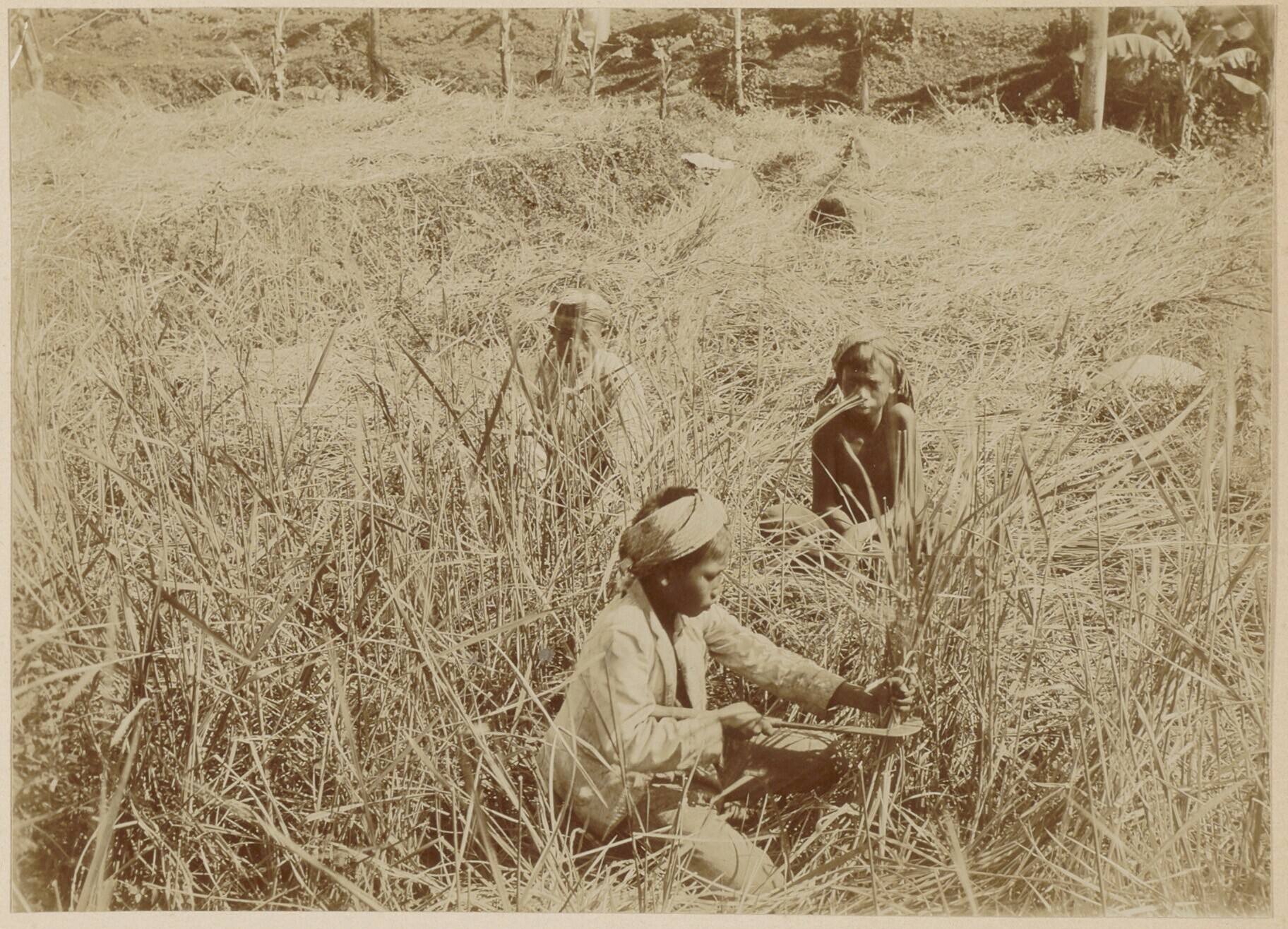 Javaanse vrouwen op rijstveld snijden stro
