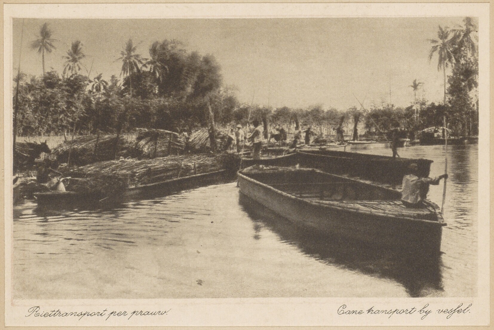 Boten op een rivier op Java met suikerriet