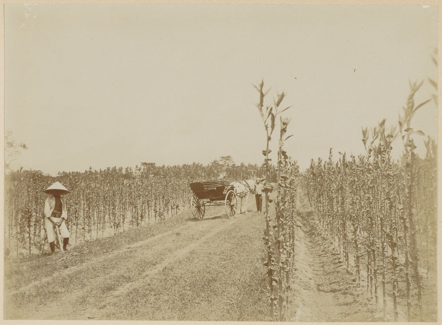 Akkers met rijtuig op tabaksplantage