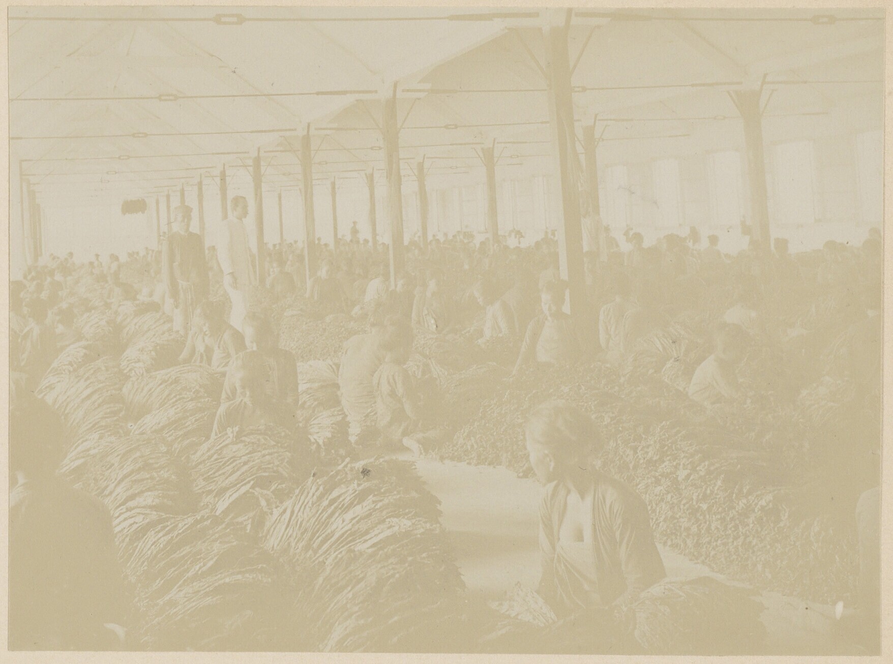 Javaanse arbeiders sorteren tabak in een loods