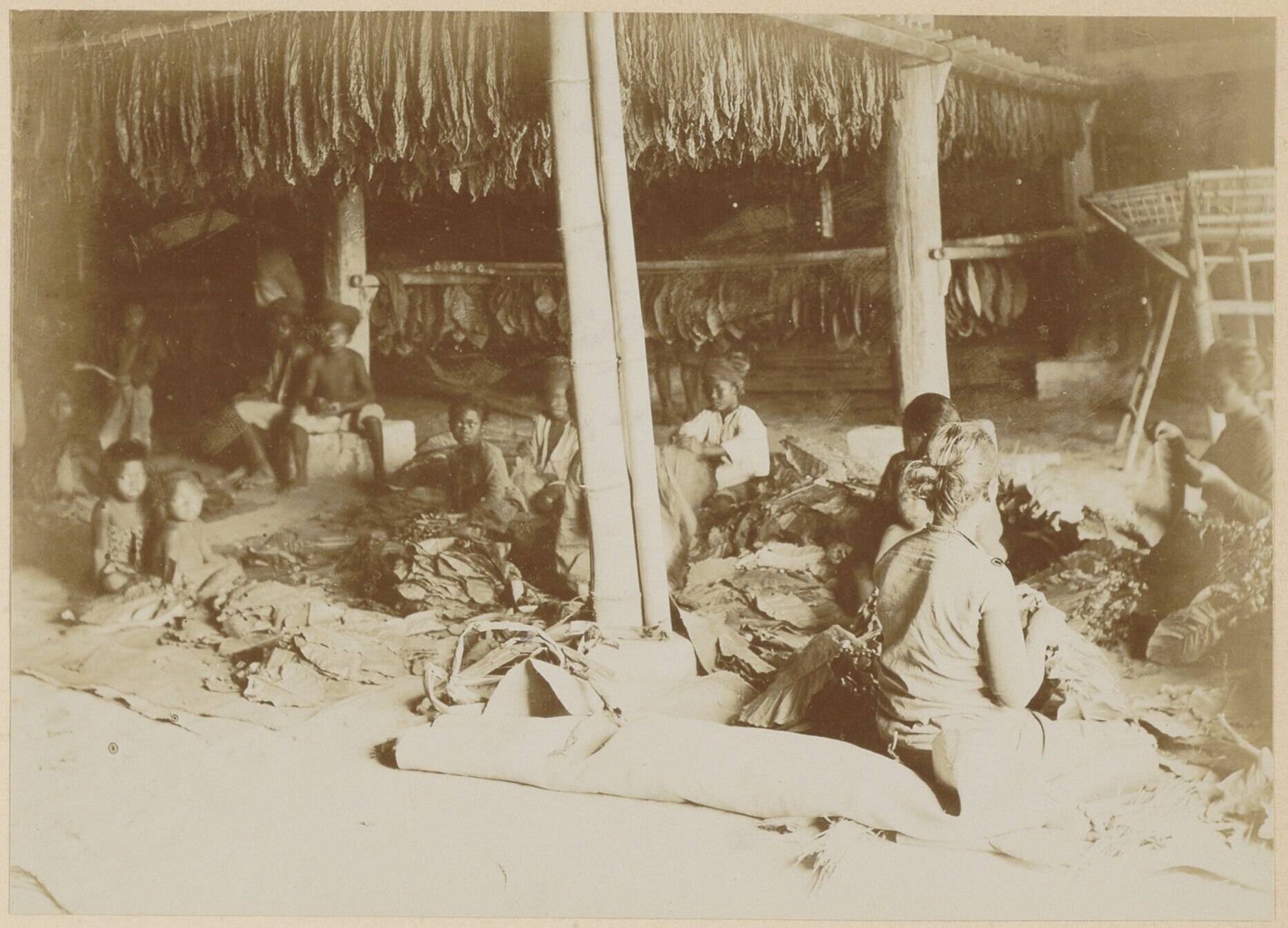 Javaanse arbeiders rijgen tabaksbladeren in een loods