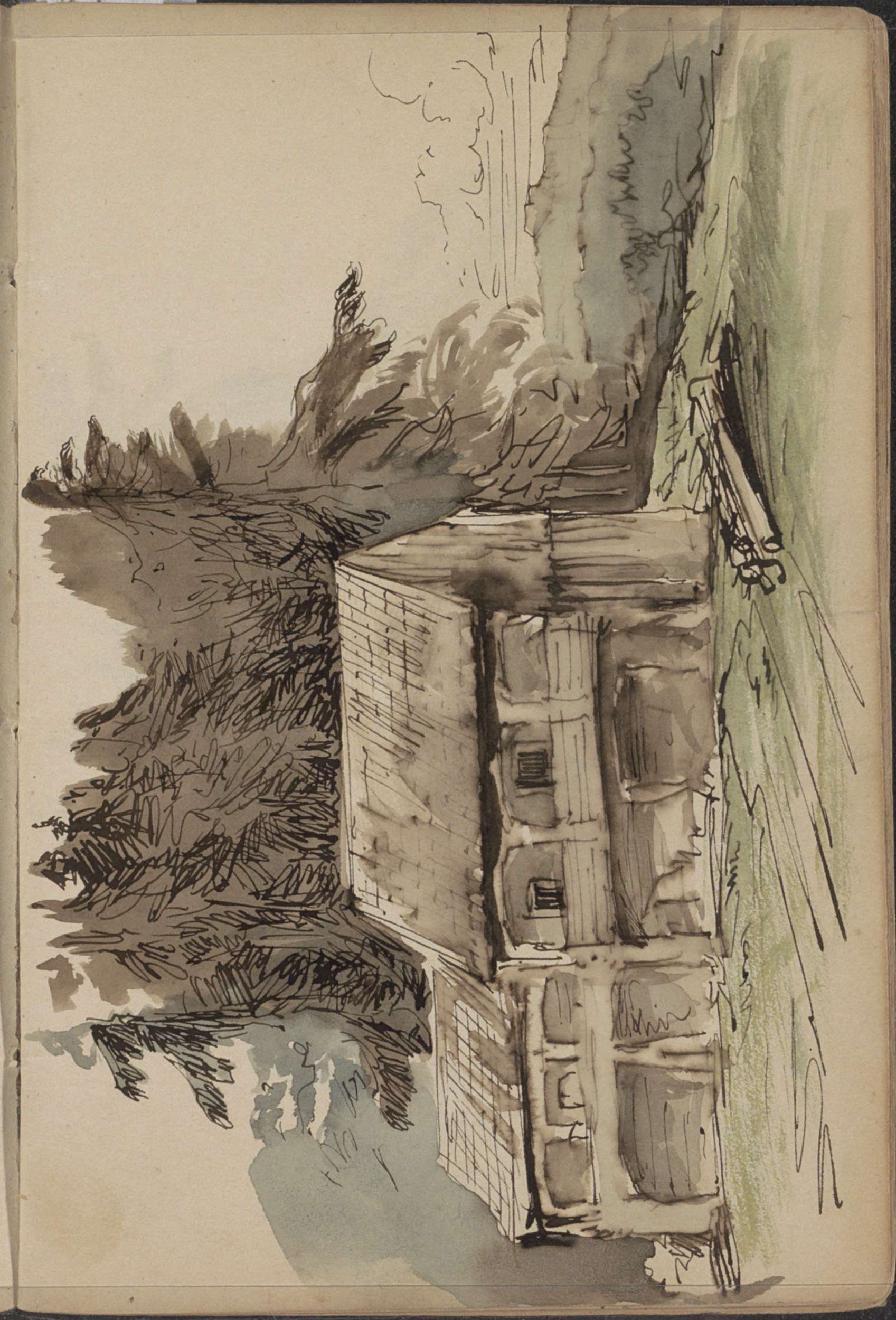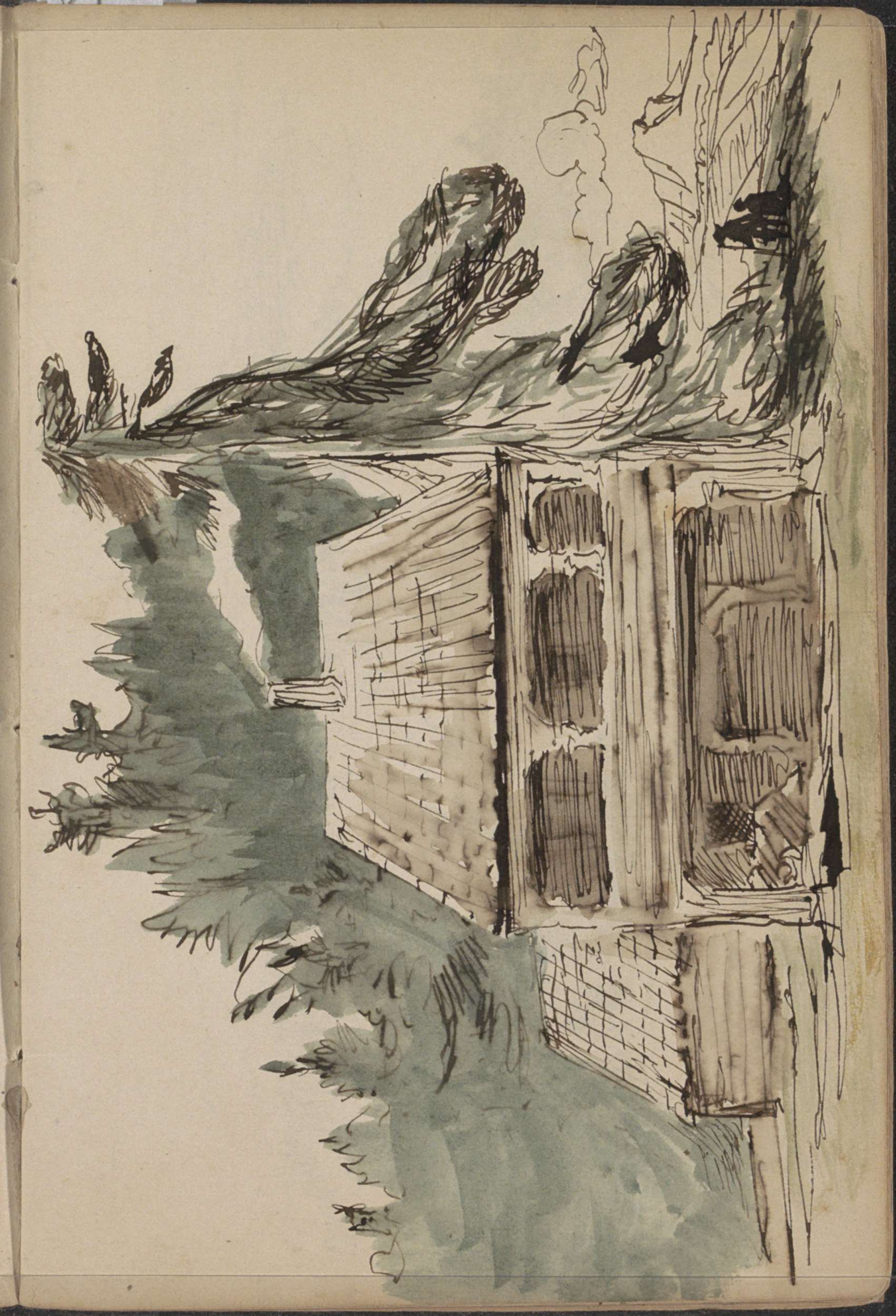 Figuren bij een boerenwoning naast een groep dennenb...