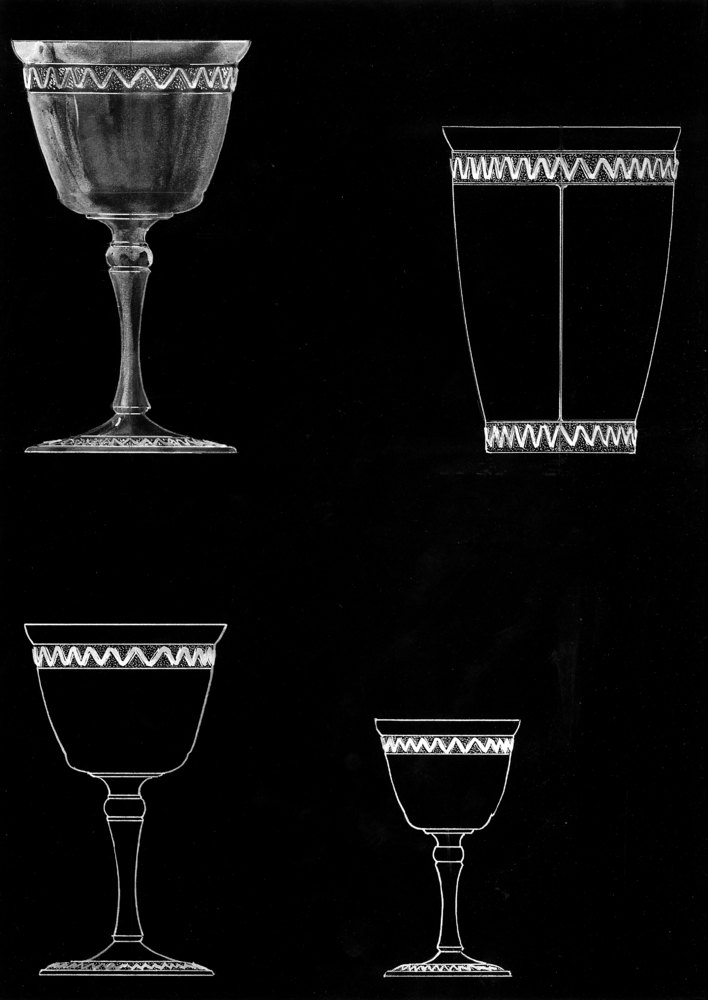 Ontwerptekening in aquarel van 2 kelken en 1 beker, ...