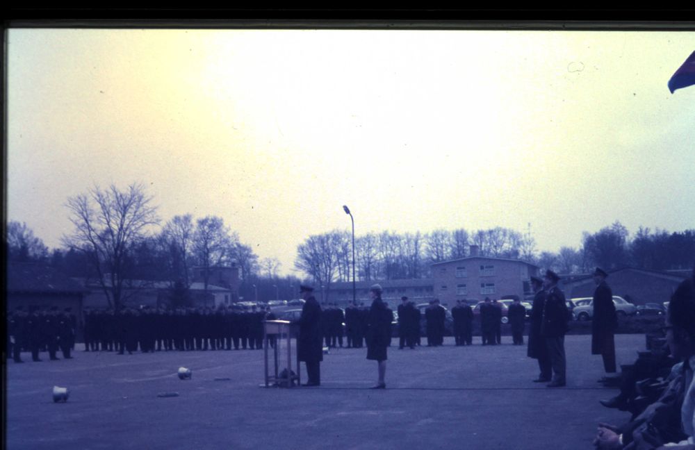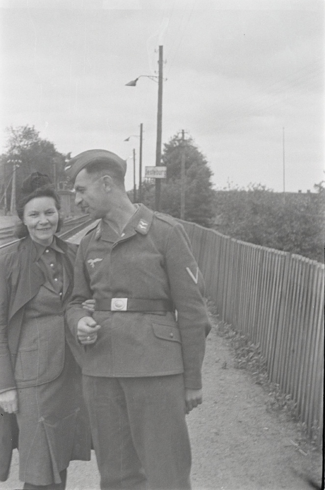 Luftwaffe Gefreiter met vrouw op treinstation Jesteburg