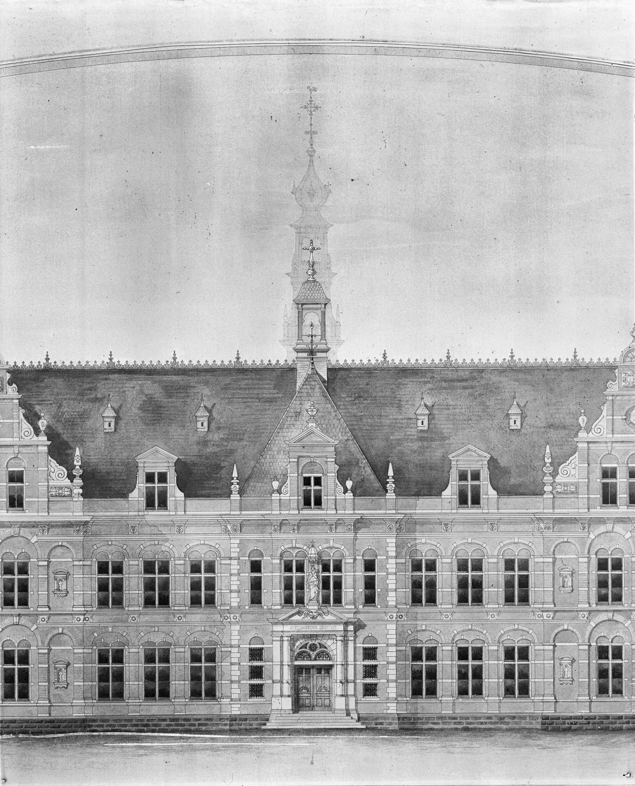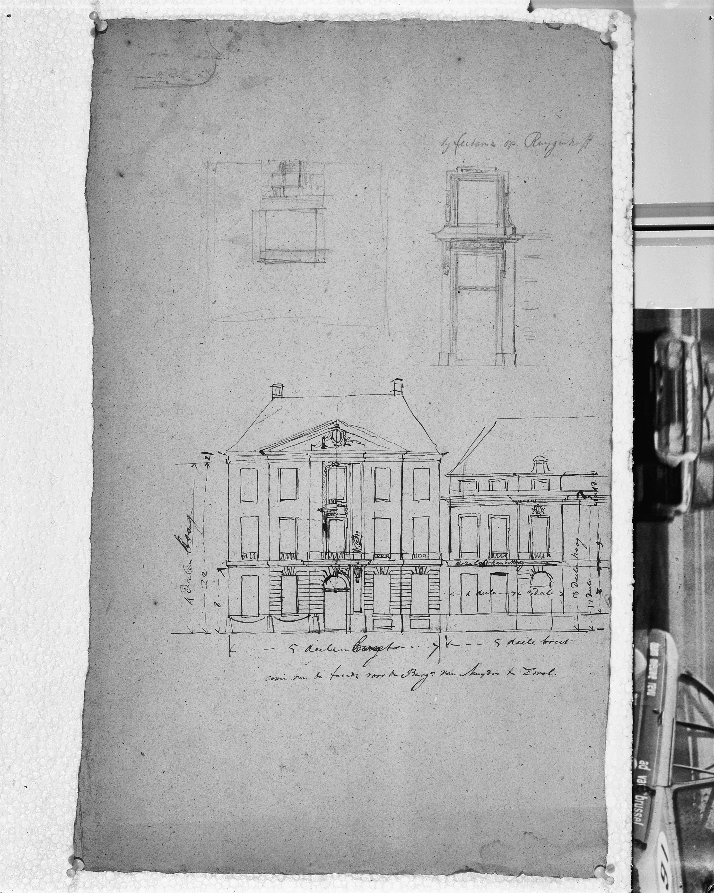 gedeelte van het ontwerp van de voorgevel in N.D.B.
