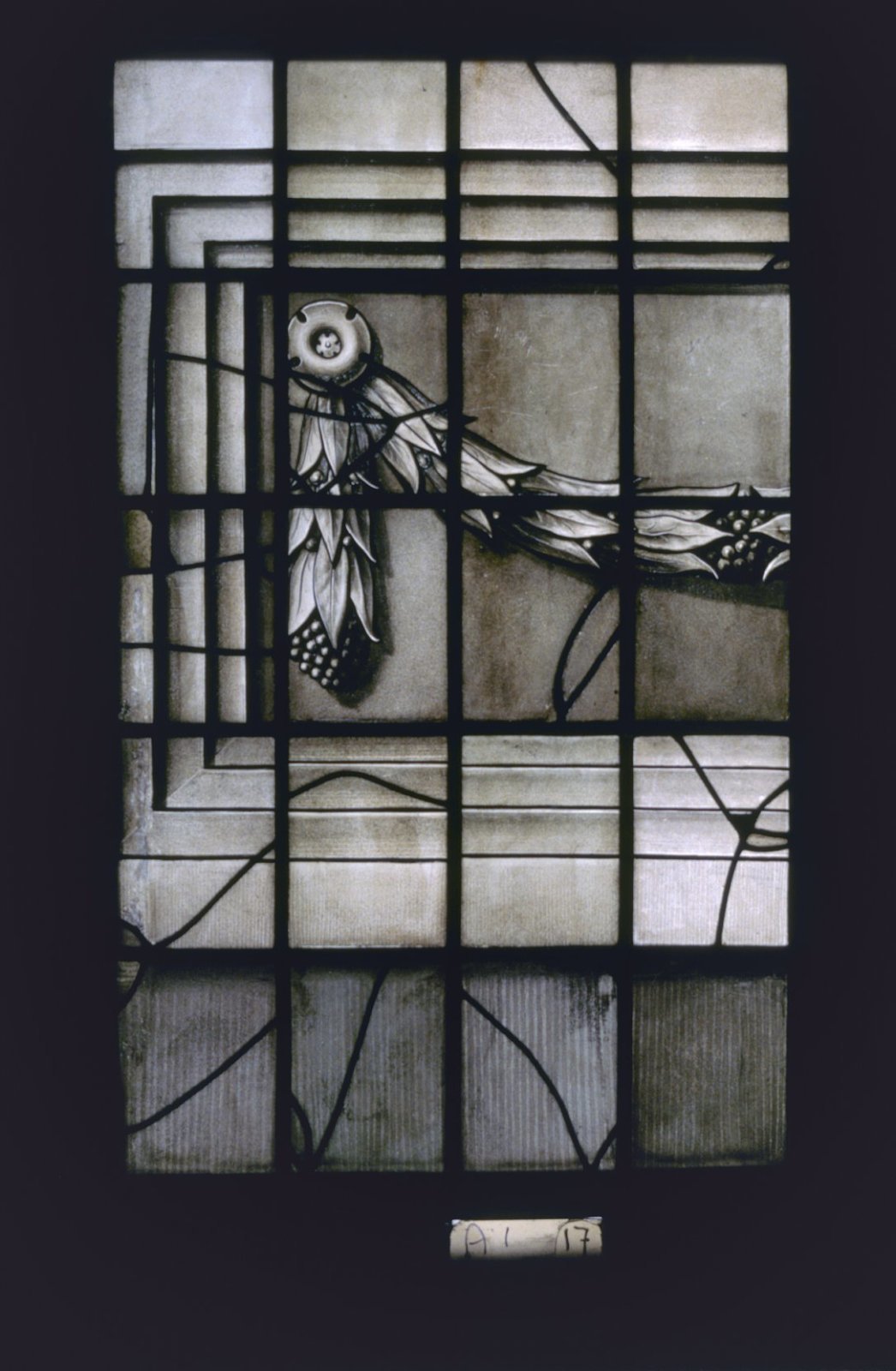 Interieur, gebrandschilderd glas, raam 17: "Makelaar...