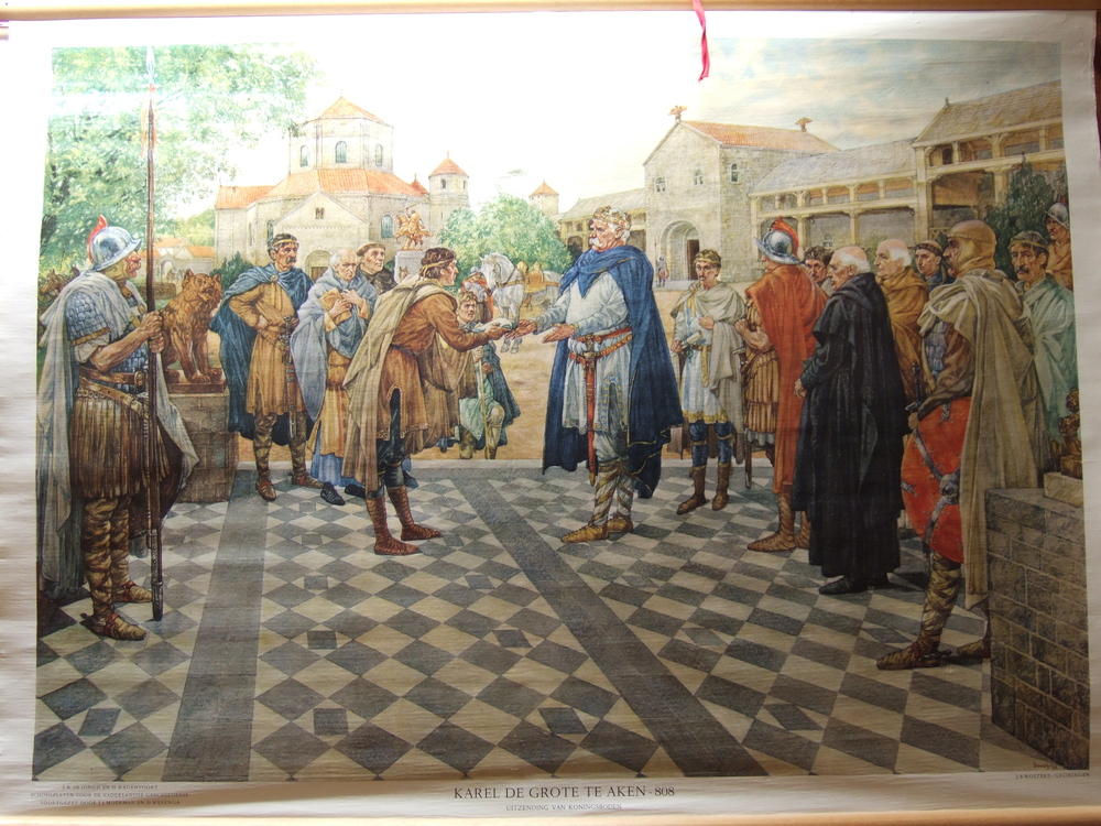 Schoolplaat op linnen, Karel de Grote te Aken - 808,...