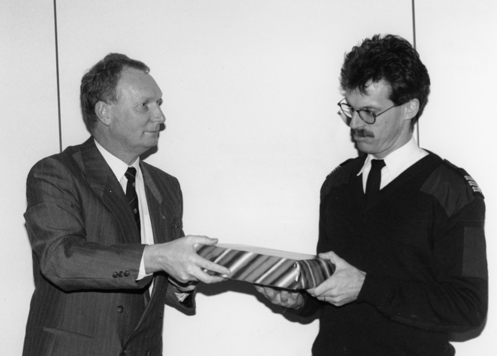 Commandant Haken overhandigt afscheidscadeau aan bra...