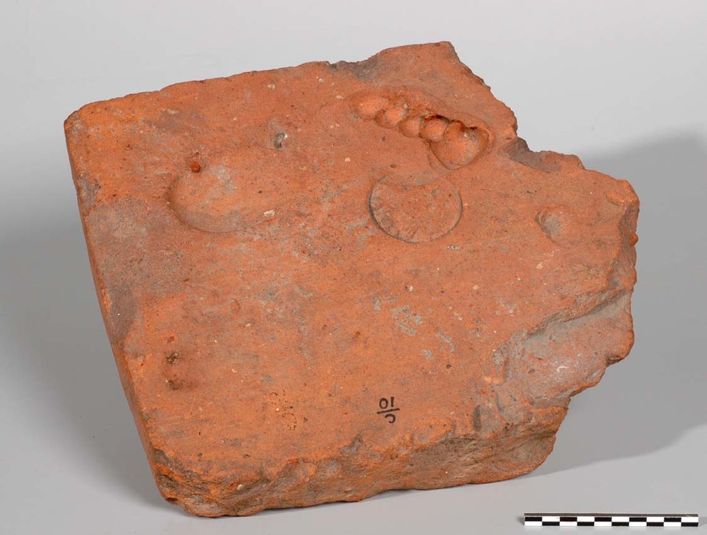 Tegel van baksteen met voetafdruk en stempel van de ...