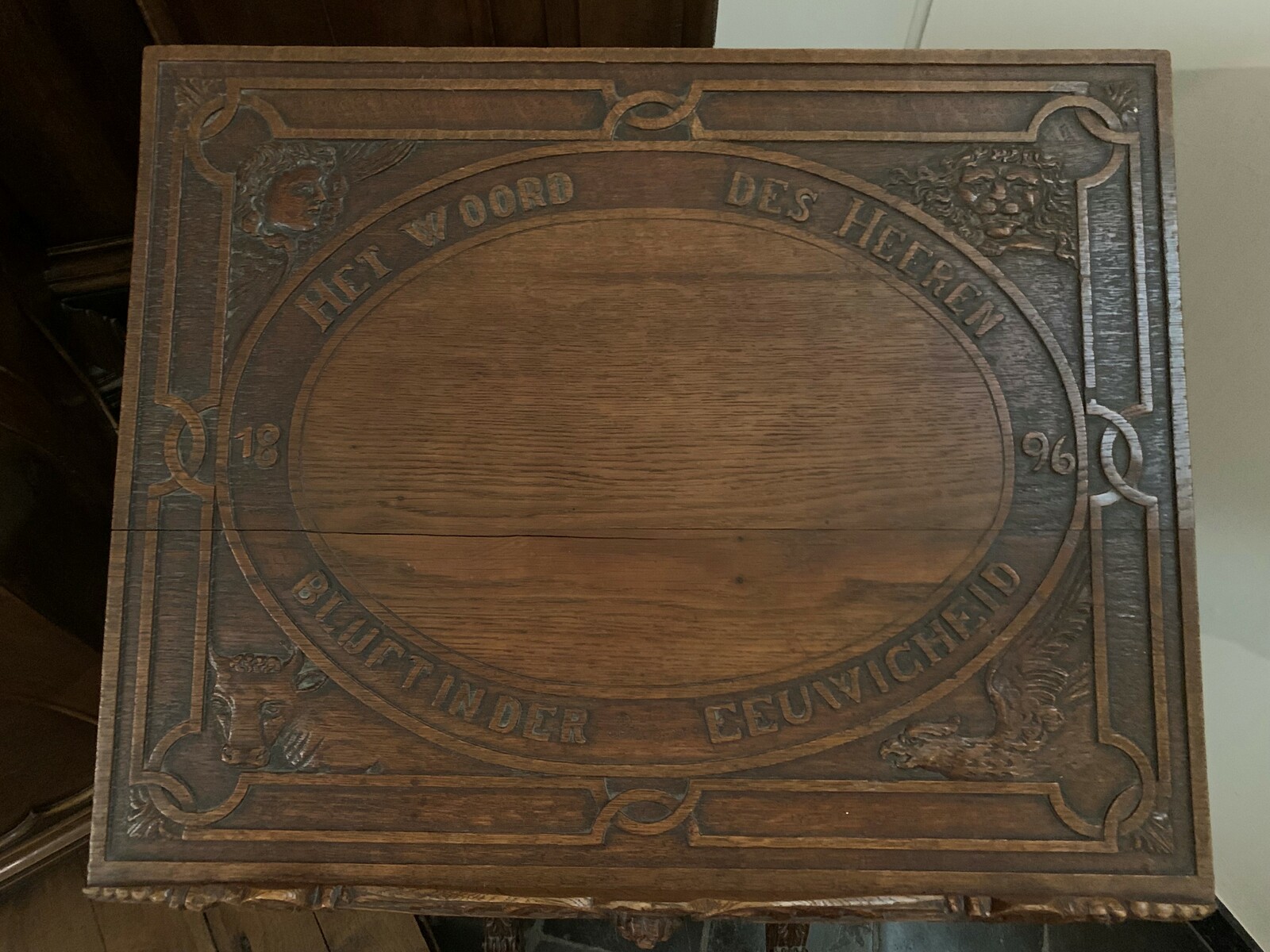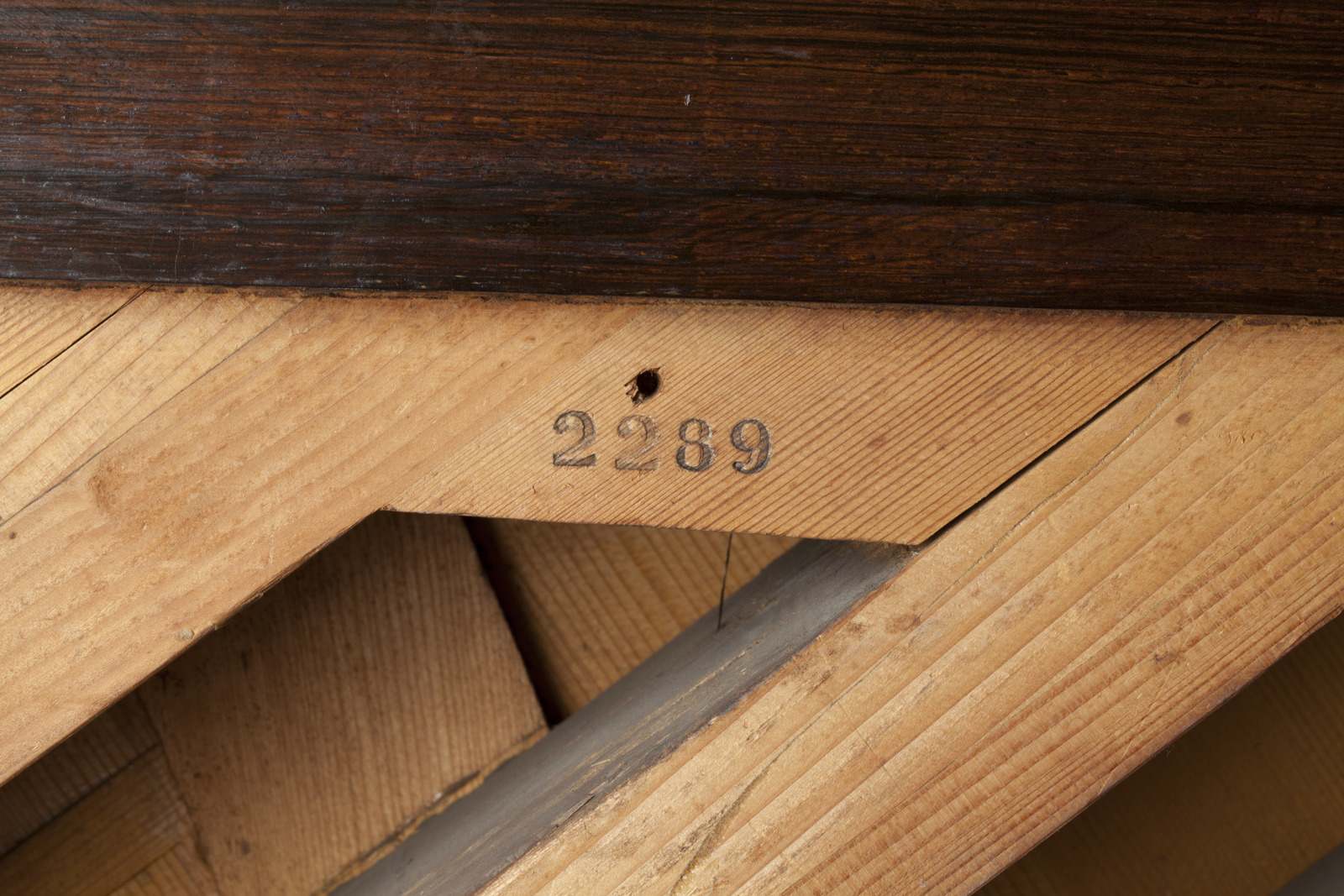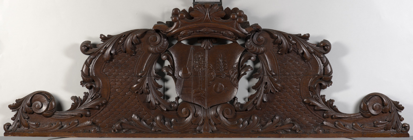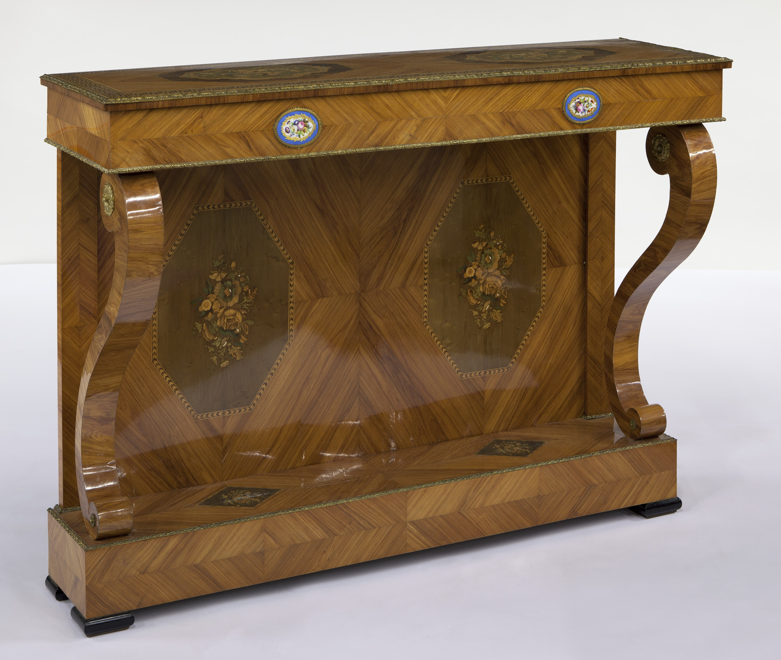 diverse houtsoorten belijmd met padoek- en cederhout, versierd met beschilderde wit marmeren plaquettes (1)