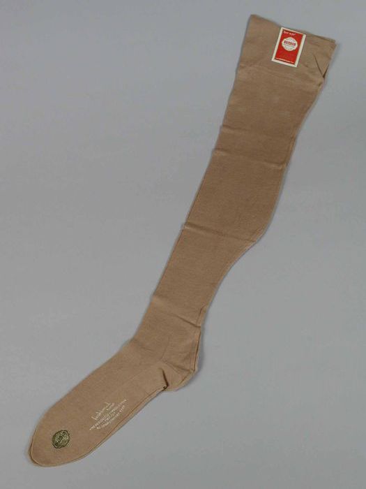 Paar lange beige kousen van fijn tricot katoen met k...